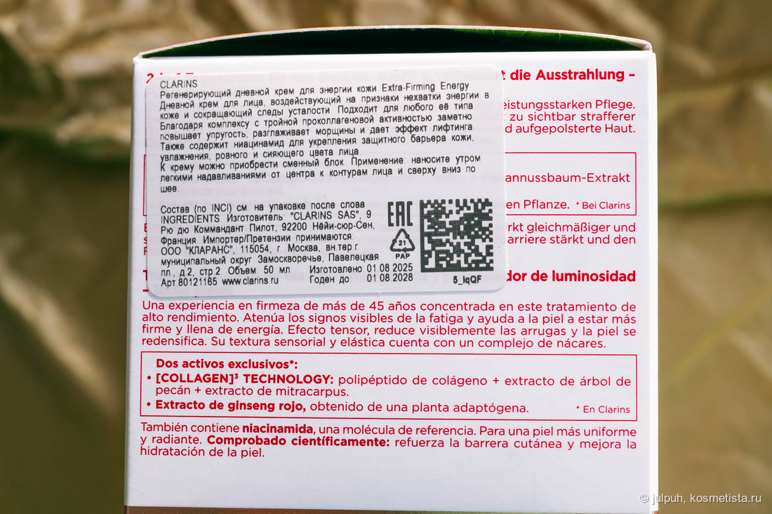 Производитель обещает нам наполнить кожу энергией и сиянием. В этом помогают: полипептид коллагена, экстракт пекана, экстракт красного женшеня, ниацинамид и другие интересные компоненты.