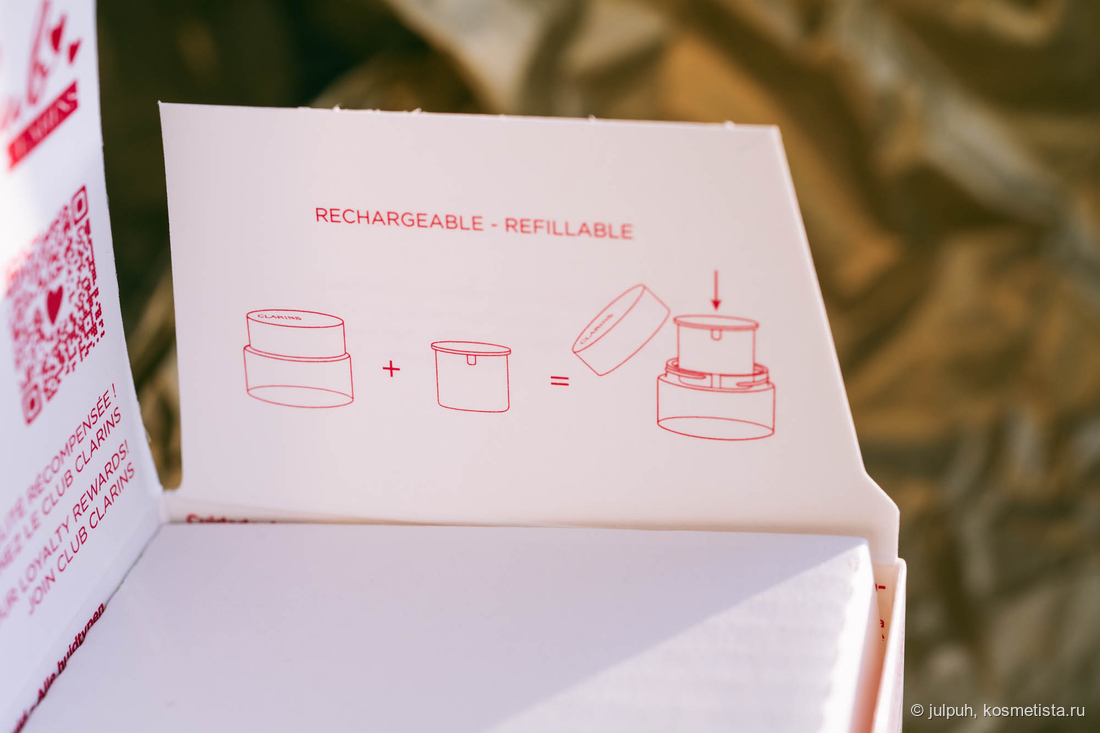 Важное нововедение в концепции кремов Clarins – теперь продукт можно купиь отдельно в рефиле, по сути в таре, которая вставляется внутрь стеклянной баночки. Это выгоднее экономически для покупателя, а также меньше вредит природе.