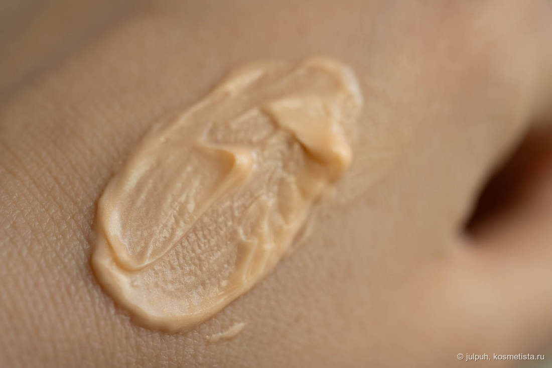 Текстура крема муссовая, пружинистая. Оттенок довольно заметный насыщенный оранжевый. В составе креме есть перламутровые частички, они очень заметны при нанесении.