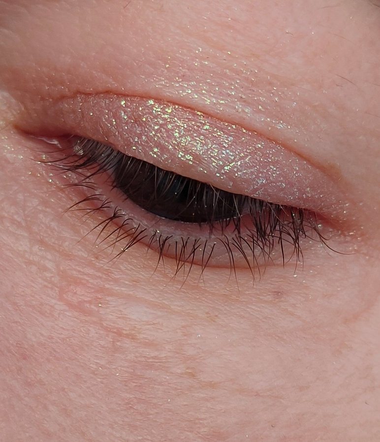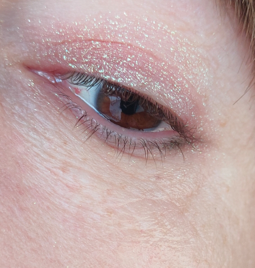 Заявлен он розово — золотистым.😊 Я порой, вижу больше серебристые сияшки, чем золотистые. В этом тоже, я думаю проявляется эффект дуохрома.😄 Зависит конечно так же, от того, на какую подложку наносить. На фото ниже функцию подложки выполняют светло — коричневые тени.