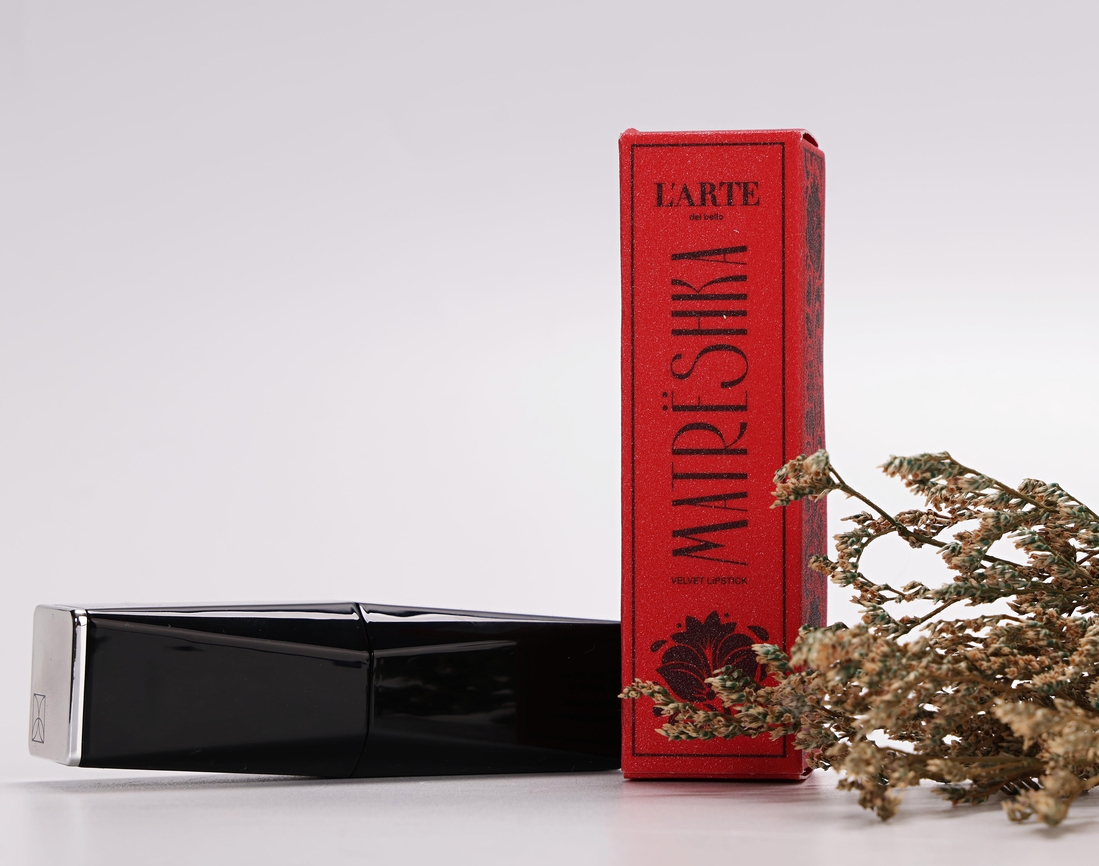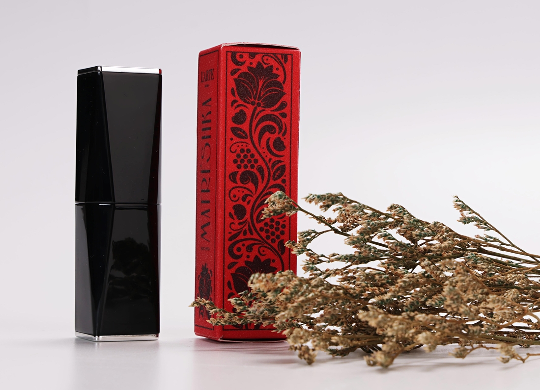 4 гр помады в объемном добротном футляре. Тяжеленький, магнитный, с серебристыми элементами. Коробочка шершавая, визуально будто в засыпке — такой картон. Всякая роспись в стиле народных промыслов для меня была неожиданной.