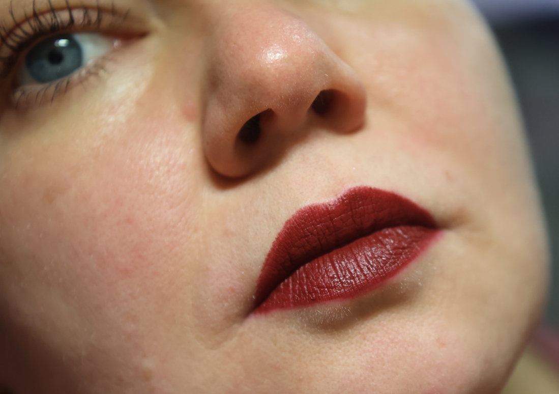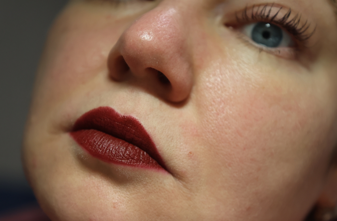 За все время носки помада никуда не девается. Оставляет следы на кружках, но не течет. Матовая, но не глухая. Остается подвижной. По сути это кремовая помада с матовым финишем. По ощущениям чуть суше, чем другие помады, но не то, чтобы очень криминально. Проблемы не подчеркивает.