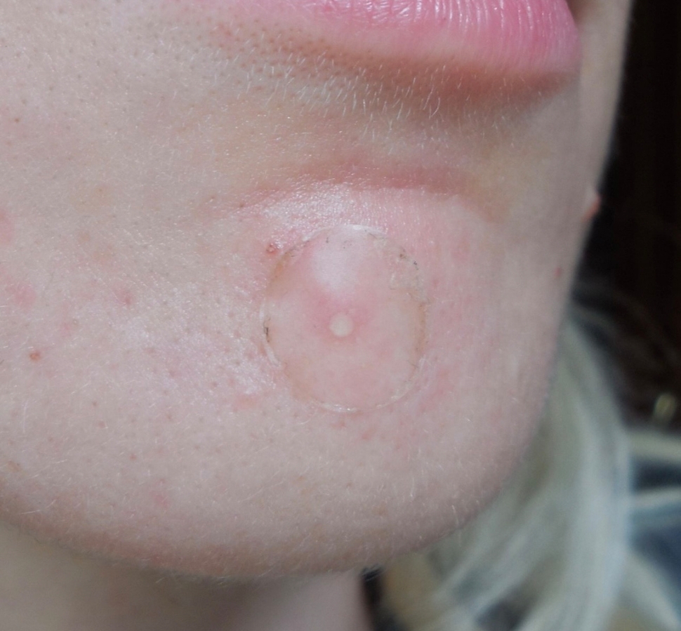 Давайте посмотрим на примерах. До приклеивания патча был просто рельеф и немного болело высыпание. По моему личному опыту такое проходит весьма долго и мучительно. Здесь же патч быстренько вытянул всё лишнее наружу и в разы сократил время до полного заживления.