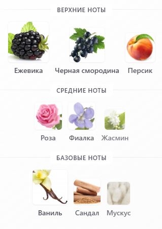 При распылении первыми нотами ощущается некая терпкость, мне она даже кажется свежей. Предполагаю, что так я ощущаю чёрную смородину и шелковицу. Длится эта нота буквально секунд 15 -30 и усаживается. Дальше слышу нечто среднее между кисленькой смородиной и уже более сладкой ежевикой. Свежинка мне чудится за счёт древесных нот, скорее всего. Чернику не чувствую. Вообще, я не люблю эту ягоду, настоящая она мне кажется «никакая», а искусственные отдушки химозные, например в йогуртах, вызывают только тошноту. Поэтому хорошо, что черники тут нет. Через пол часа показывается пион. Лёгкий, воздушный, едва уловимый. Остальных нот я не слышу вообще.