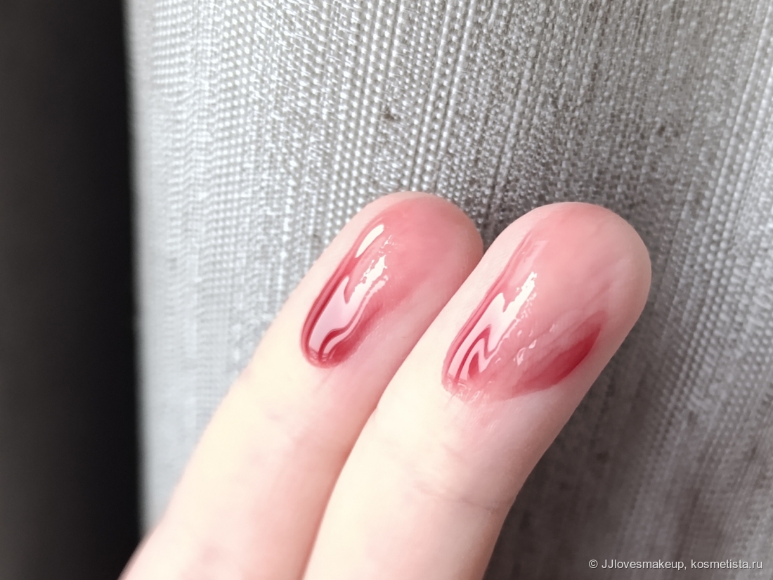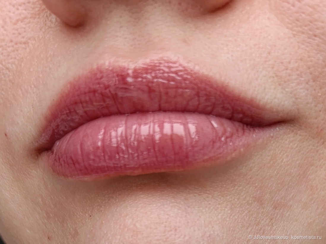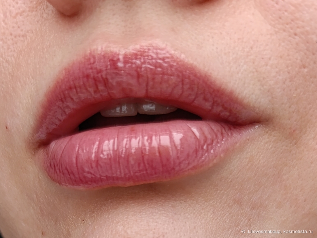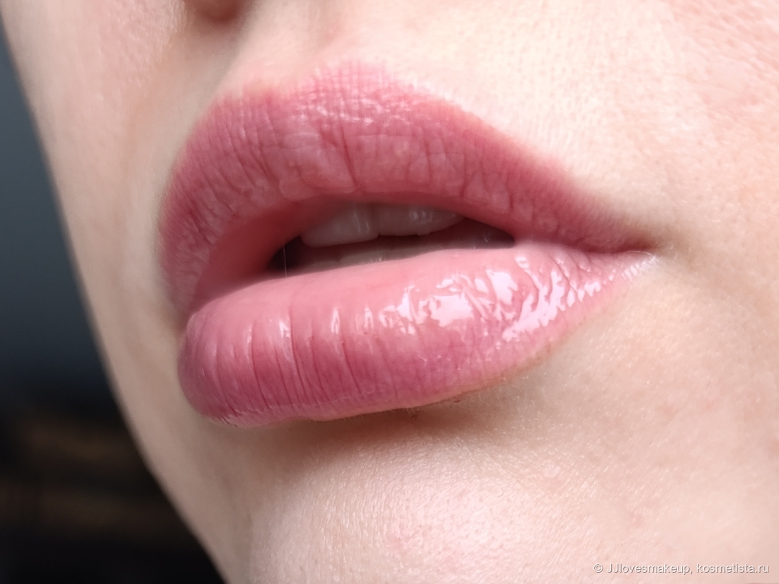 На губах даёт едва уловимый оттенок, хорошо блюрит губы. Настолько хорошо, что камера отказывается фокусироваться (фото четкие, видно текстуру кожи, но губы как будто скрыты вуалью. Глянцевой водянистой вуалью). Здесь два слоя: