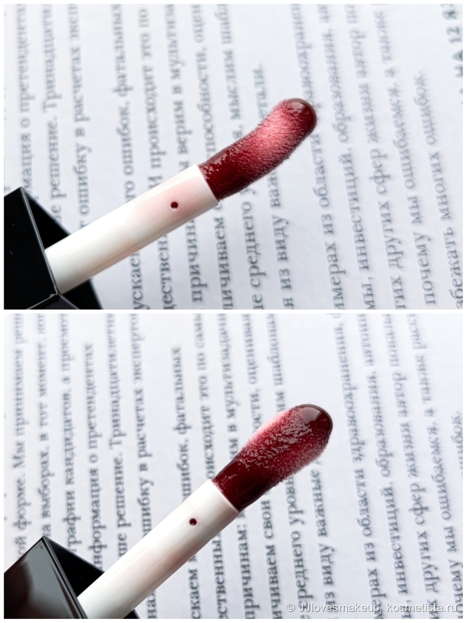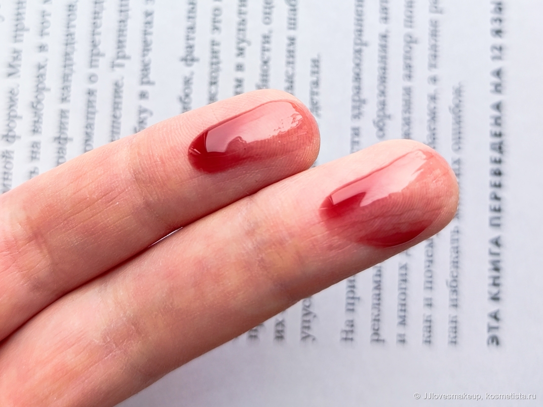Оттенок: объективно, мне очень нравится. Как будто пригубила вина и накрасилась прозрачным блеском. На свотче это прозрачно-бордово-винный, без сиреневого, лилового и т.д, просто темный красный, приглушённый и настоявшийся: