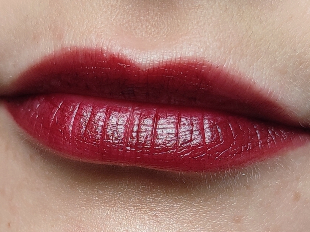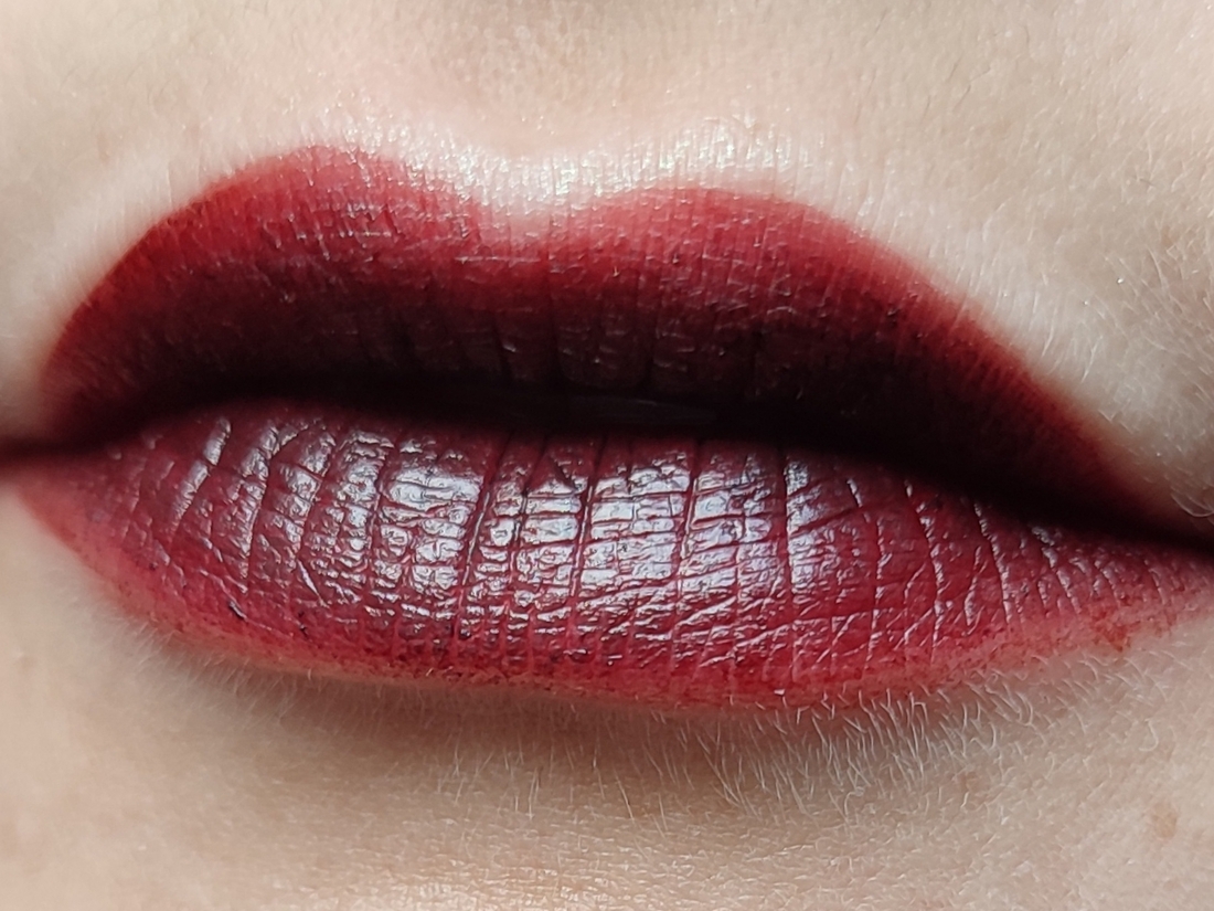 Но в последнее время мне нравится его наносить на все губы. Он даёт такой шикарный винный цвет! Вот эта яркость спокойно держится до приема пищи. Если надоело, то можно и облизать, хех.