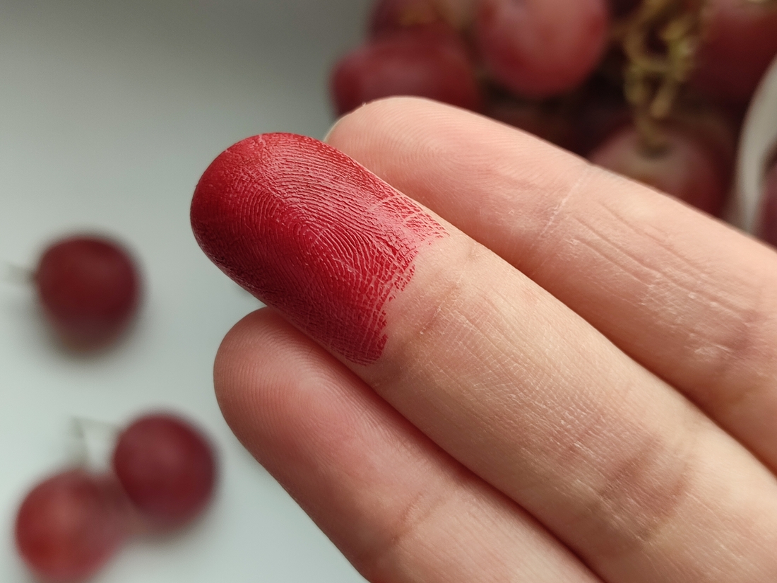 Финиш у помады сатиновый. Она не фиксируется и остаётся подвижной и влажной до конца. Отпечатывается на всех поверхностях.