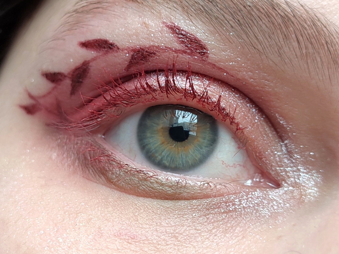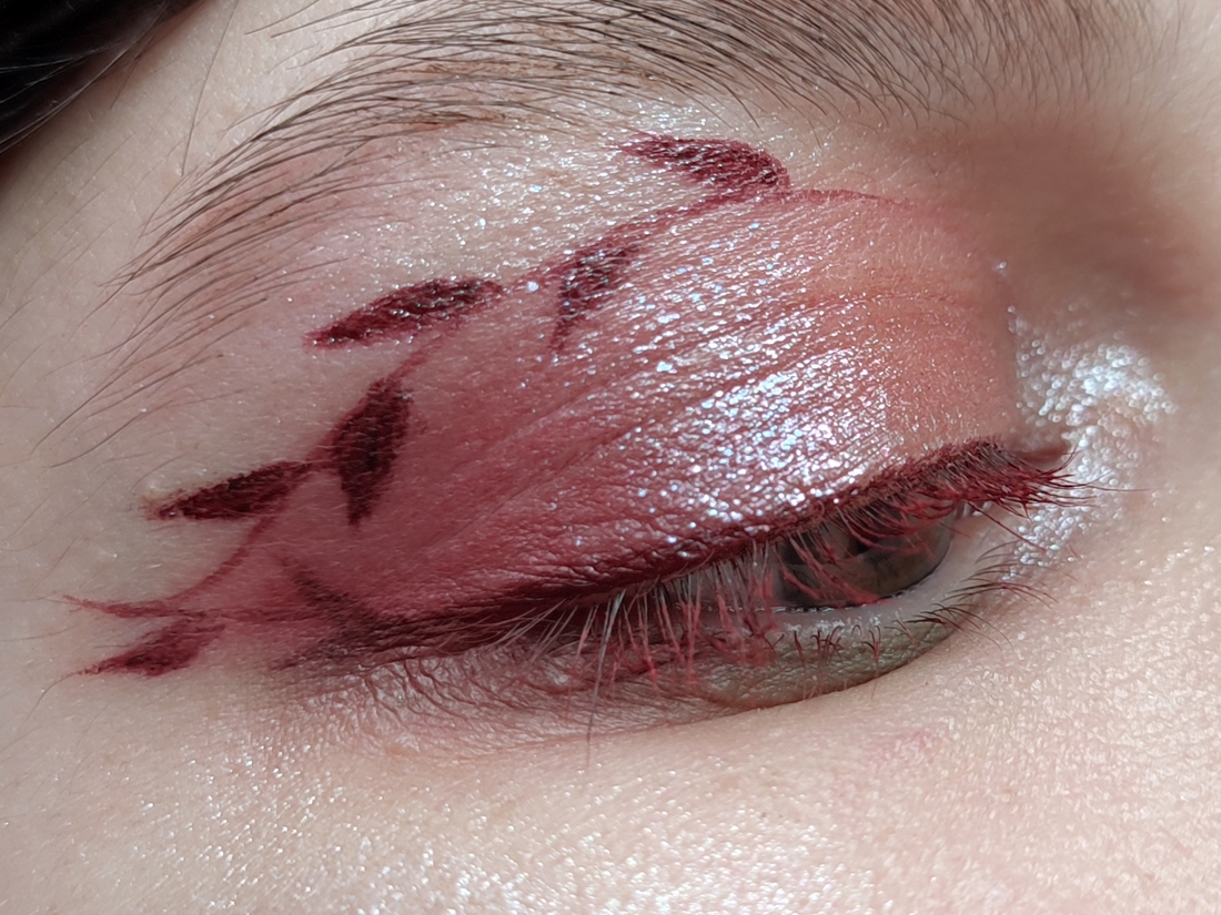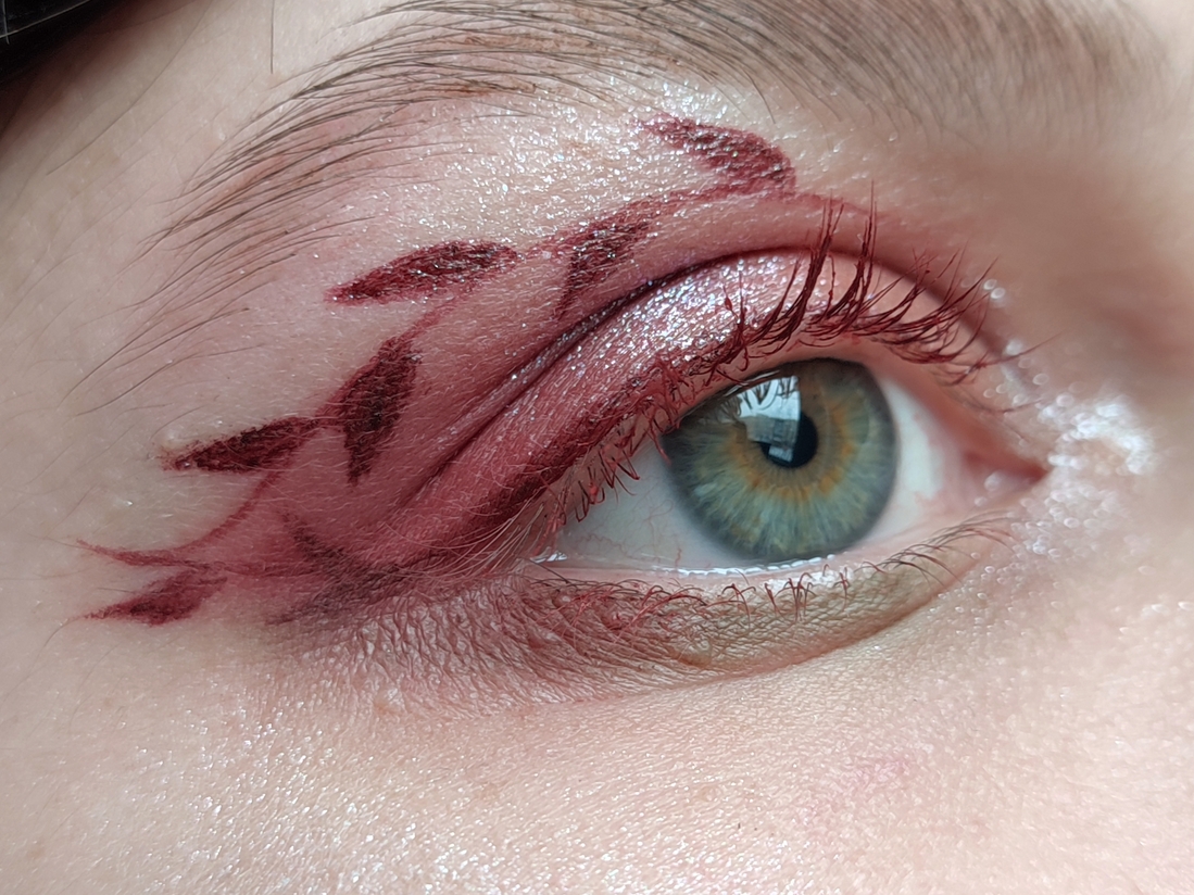 Bloody rose на все веко, Nightmare на середину подвижного. Melancholia во внутреннем уголке. Хайлайтер под бровь.