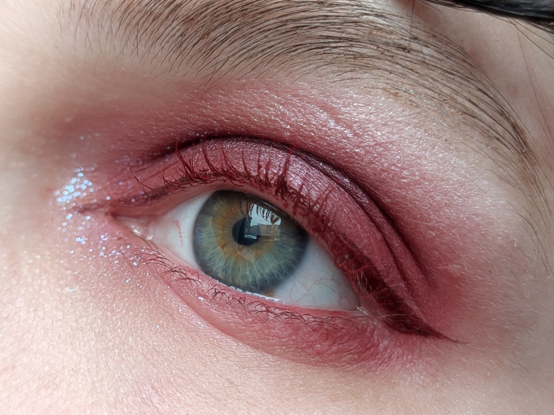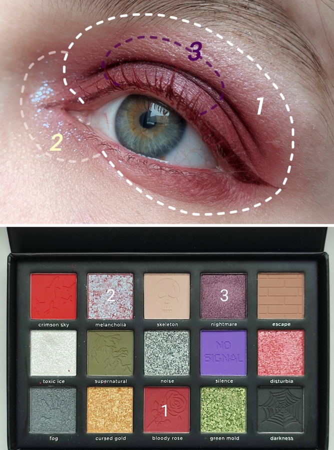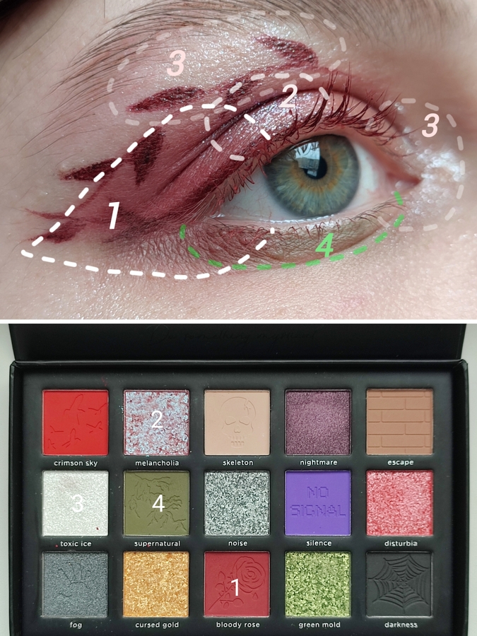 Первым шагом графика подводкой, чтоб можно было поправить. Затем: во внешний уголок — Bloody rose, на подвижное веко — Melancholia, нижнее веко — Supernatural. Во внутреннем, под бровью и в зоне хайлайтера -Toxic ice.