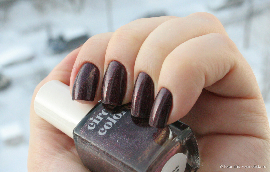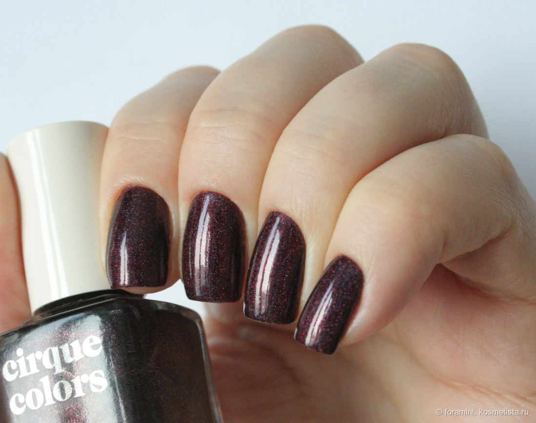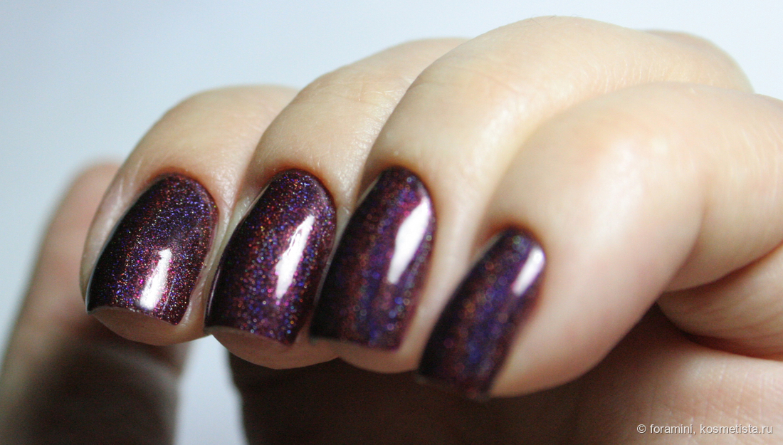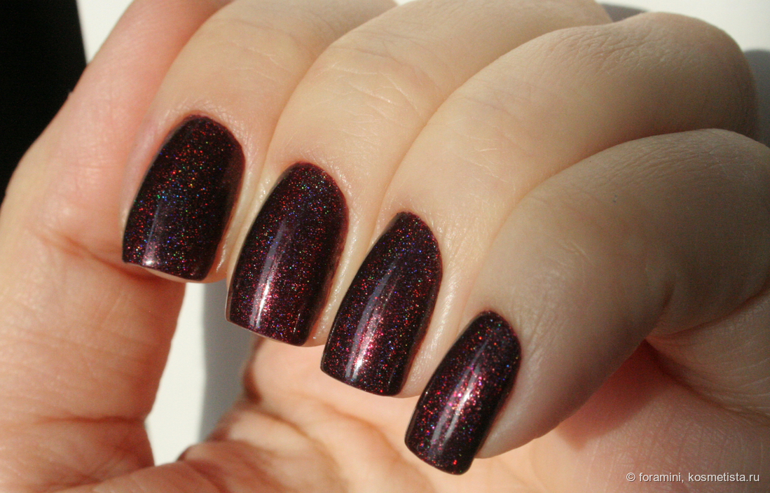 Это насыщенный винный, тёмно-бордовый линейный голографик. Голография здесь очень мелкая, при разном свете проявляет себя по-разному.