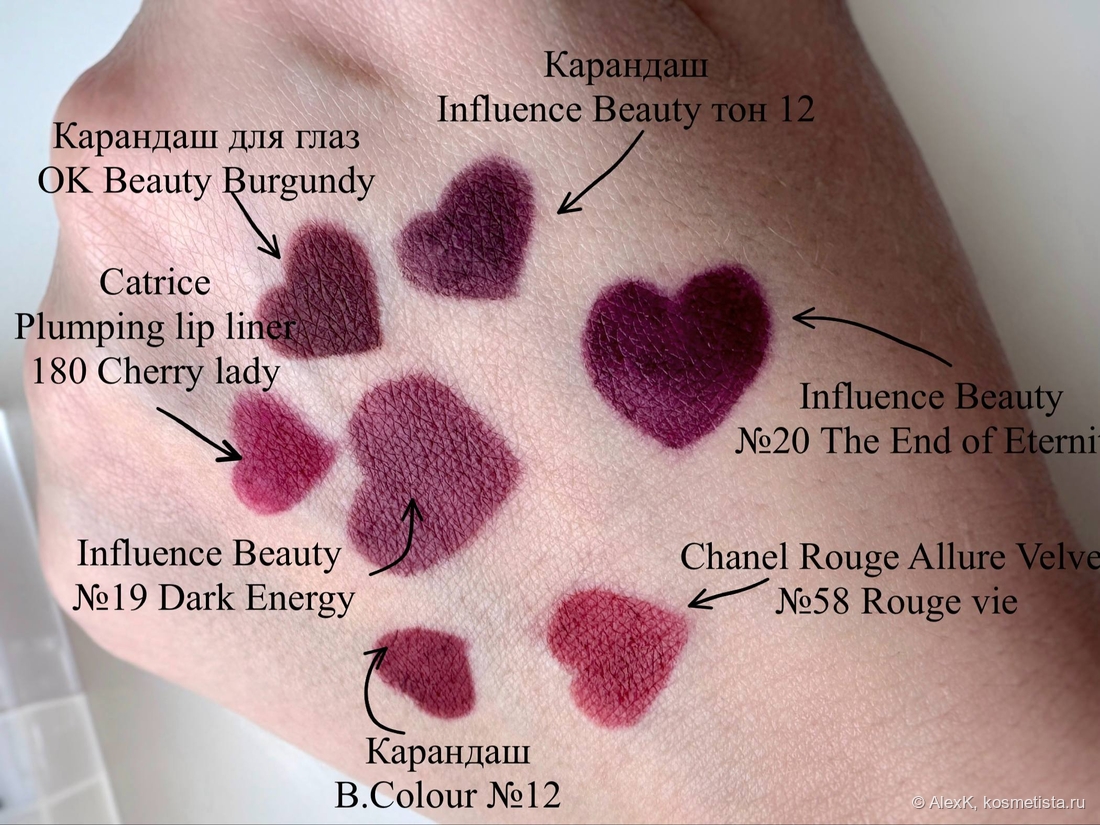 Использование. Чаще всего ношу соло. Иногда оформляю контур карандашом. B. Colour Professional Capsule №100 «Бордово-винный» подходит неплохо. Планирую протестировать сочетание с темно-сливовым Influence Beauty Lipfluence №12 — по свотчам должно смотреться интересно.