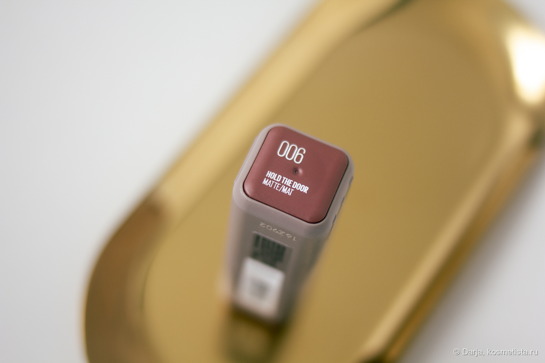 Я выбрала матовый оттенок 06 Hold The Door, «mid-tone mauve» на официальном сайте. Официальные свотчи отличались друг от друга, поэтому пришлось прибегнуть к помощи тех же социальных сетей и ориентироваться по промо-видео от разных блогеров. В итоге я всё равно представляла, какой оттенок получу, только примерно.
