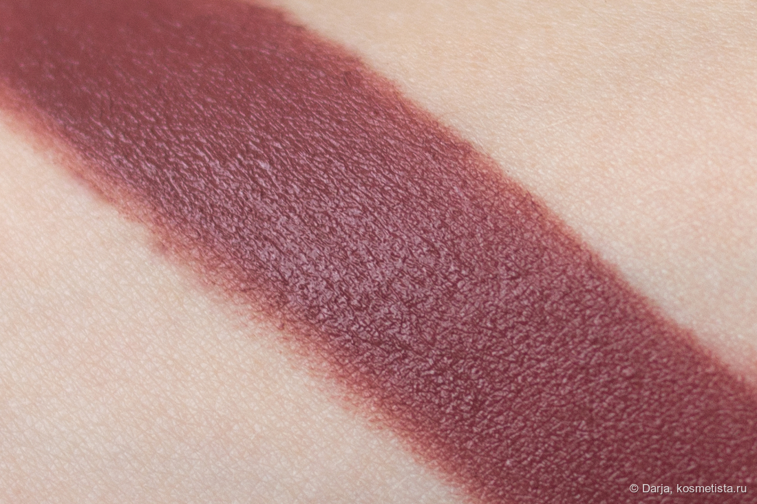 Помада очень пигментированная, как я упомянула выше, текстура очень мягкая, поэтому плотного слоя легко добиться в пару касаний. Как видно на свотче, финиш не матовый, почти сатиновый.