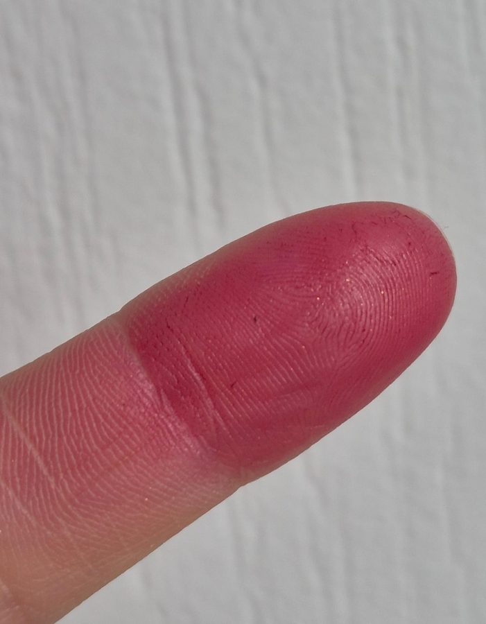 При этом если промахнетесь ( а это немудрено с таким стиком) с нанесением на губы, исправлять придется мицелляркой, ибо стейн будет мощный. Вот так выглядит палец после свотча и попытки его стереть бумажной салфеткой.