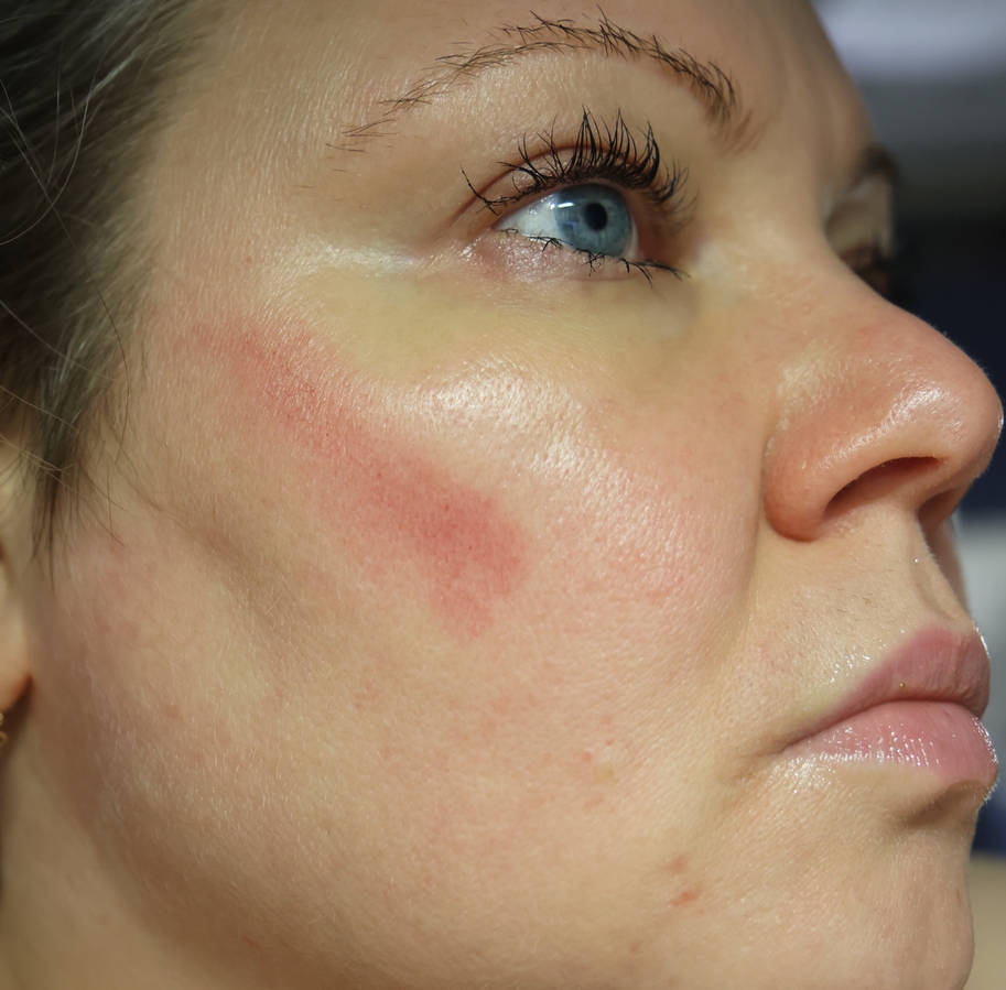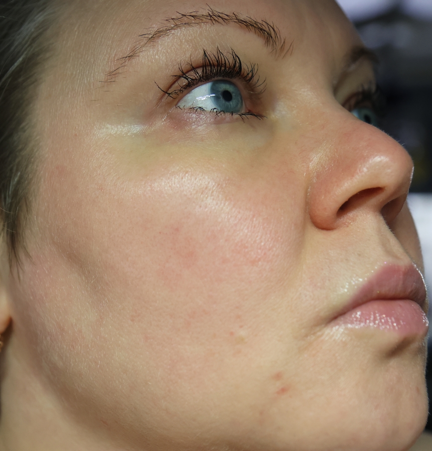 Наношу полоской на скулу и потом пальцами же растушевываю. Быстро и просто. Наношу просто на увляжняющий крем. Ниже на фото блестит именно он на коже.