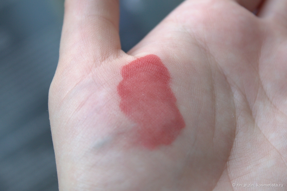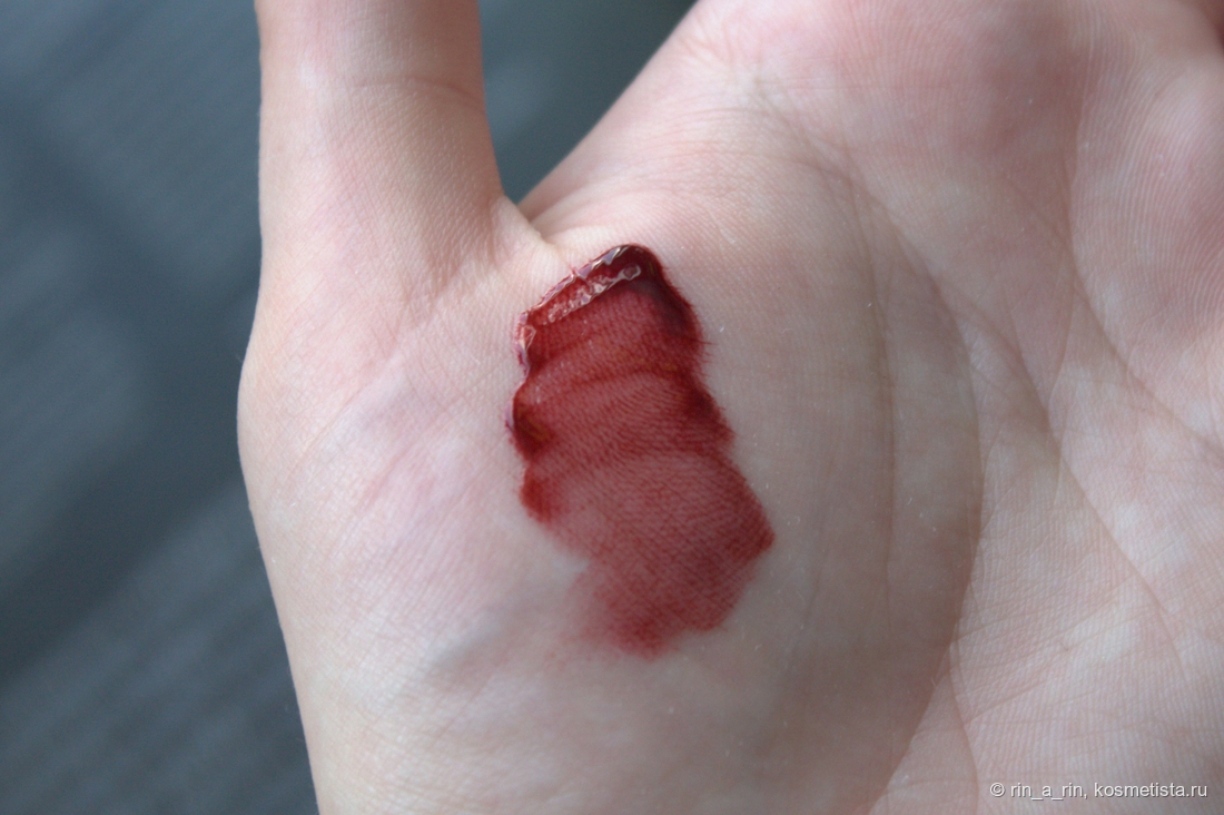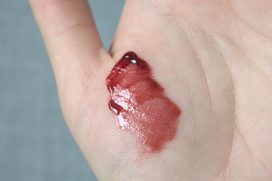 Текстура у тинта достаточно легкая, напоминает водянистый гель. При нанесении на губы присутствует ощущение некоторой маслянистости, пленочки, которая обволакивает губы и дает неплохой такой уход, но есть нюанс: пока глянец не сошел с губ — тинт не сушит и даже будто ухаживает за губами, как только остается исключительно пигмент — сразу хочется нанести бальзам или еще порцию тинта.