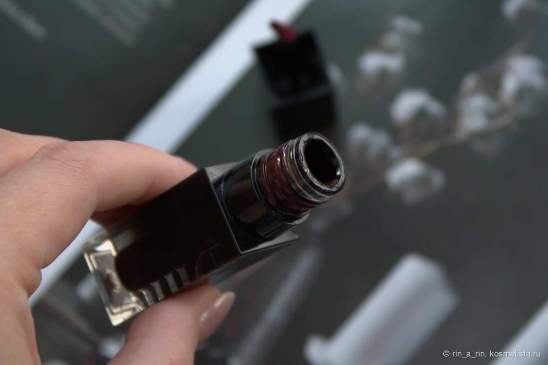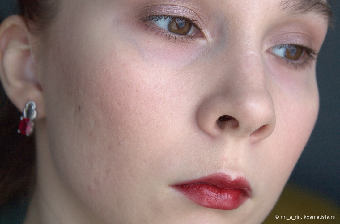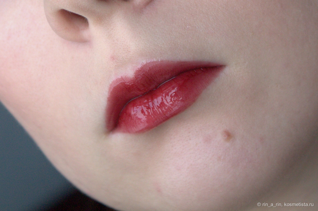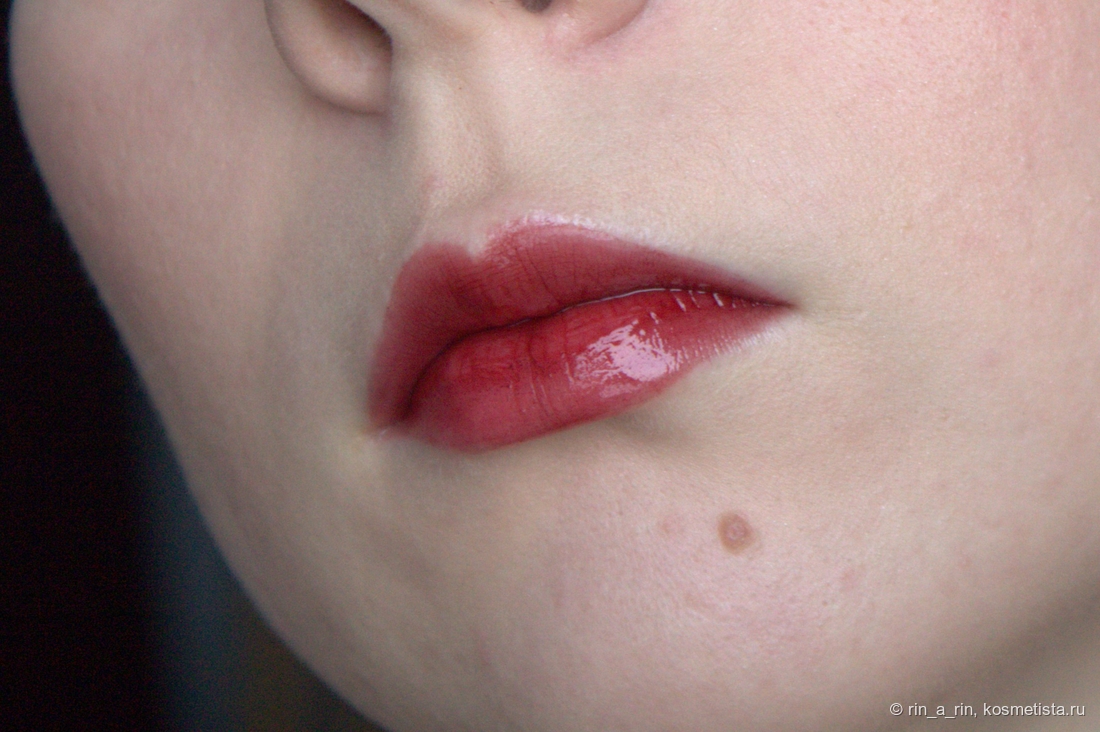 На фото всех недостатков запечатлеть не удалось, ведь они появляются лишь с течением времени, но кое-где можно разглядеть скомковавшийся пигмент. Но надо отдать должное: в целом при свежем нанесении на губах выглядит тинт завораживающе, во многом, думаю, благодаря глянцу.