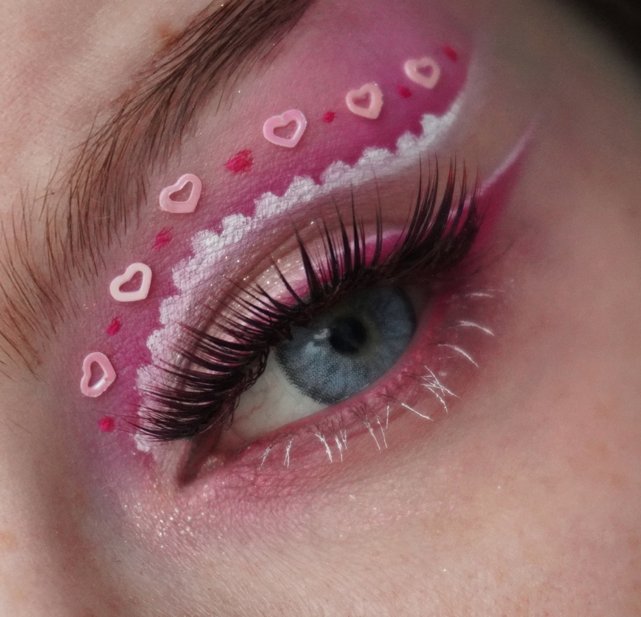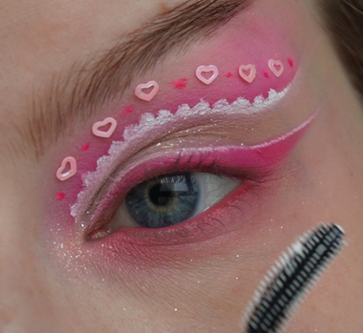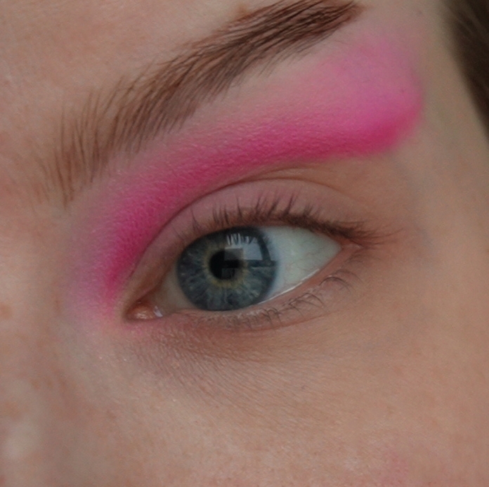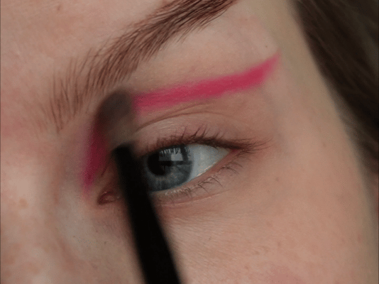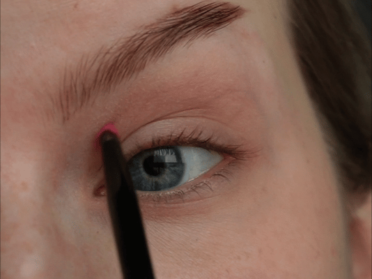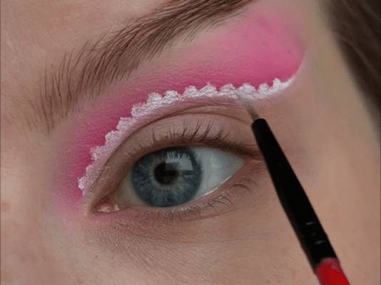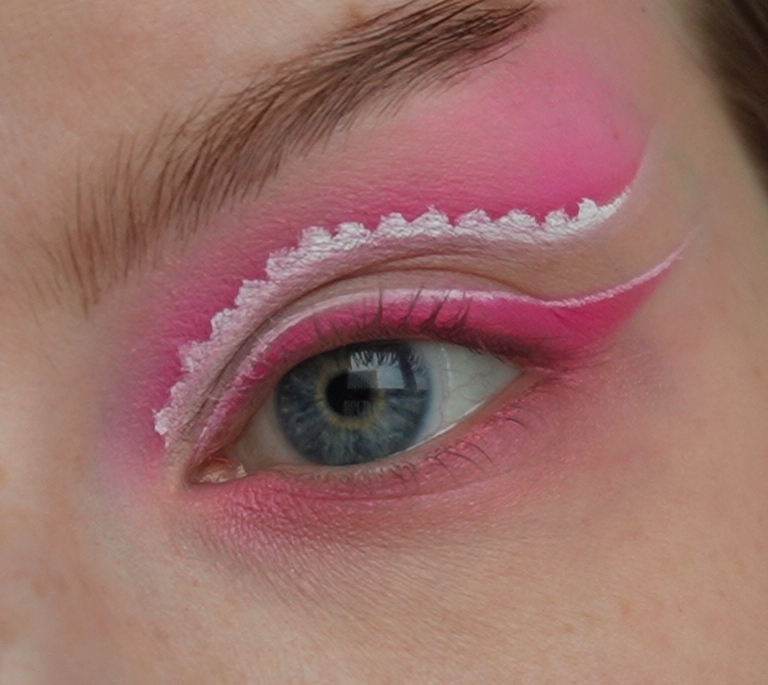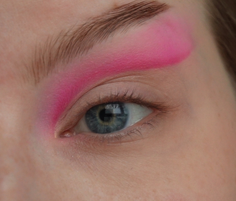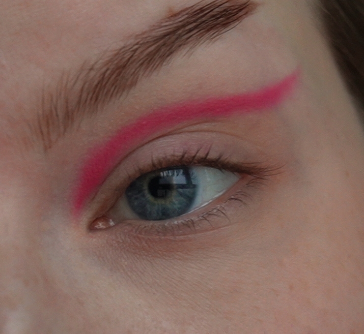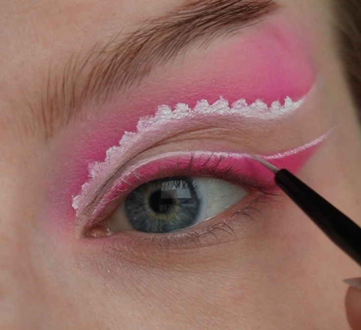 Затем ярко-розовым оттенком начала рисовать верхнюю стрелку чуть выше естественного нависания века.