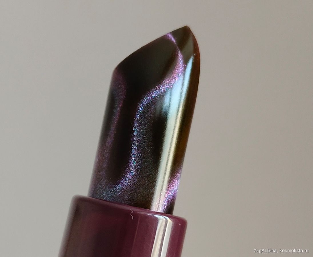 Но вот сам стик помады залипательный, темный бордовый с розово-фиолетово-голубой дорожкой.