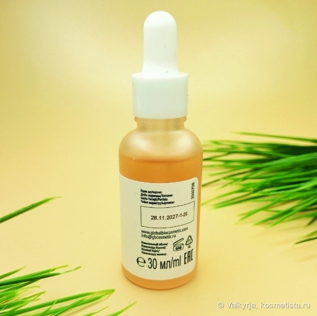 Про упаковку буду говорить, но недолго. Основная — картонная коробочка, которая при покупке оффлайн привлекает на себя внимание. На её обороте представлена полная информация о сыворотке, её компонентах, и о производителе.