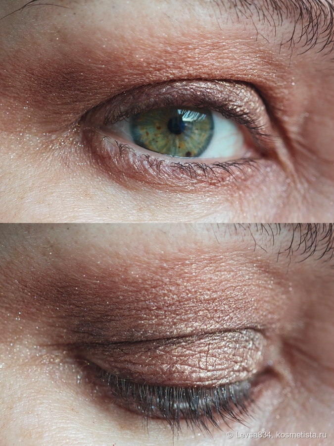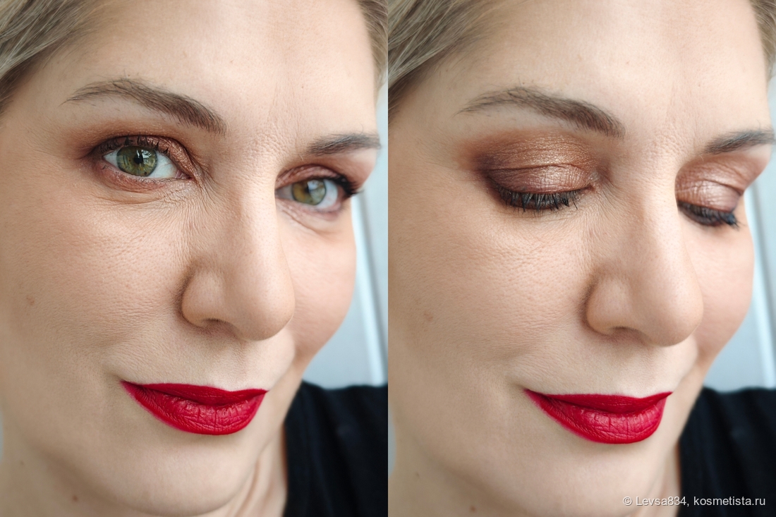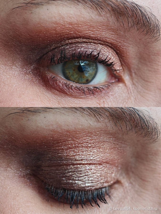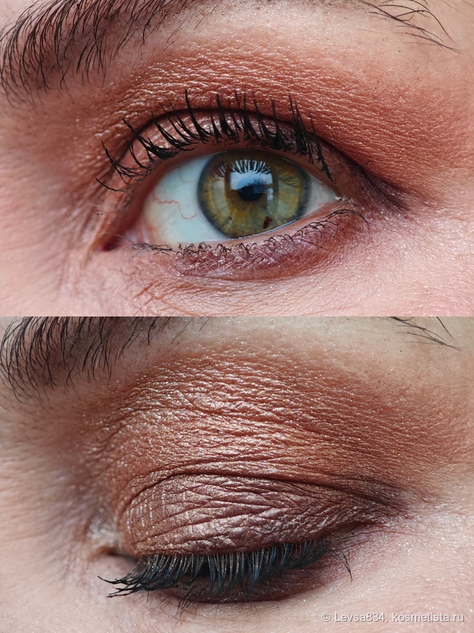 И по палетке в целом: все оттенки пигментированные, все стойкие даже без базы. Осыпания при неверной технике нанесения возможны, убираю их при помощи бумажного скотча. В течение дня тени не тускнеют, не собираются в складках. Глаза не раздражают.