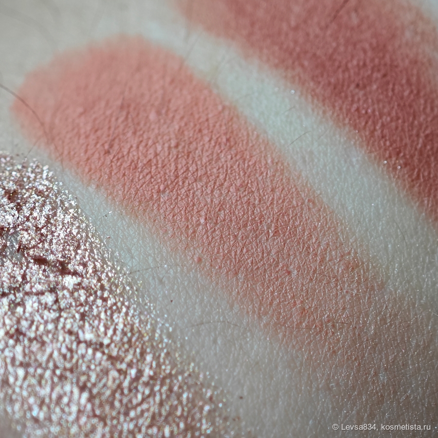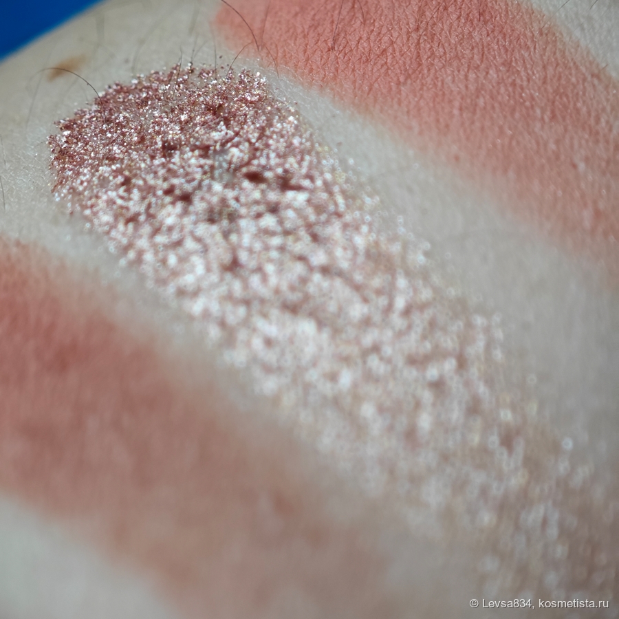 Единственный шиммерный оттенок в палетке, я бы назвала его магией Деноны — он фантастический по характеристикам и умеет гармонизировать и улучшить любой макияж. Сверкает на солнце отдельными частицами, очень нарядный, при этом не переигрывает. Может осыпаться при нанесении. Оттенок светло-персиковый, нежный, тёплый.