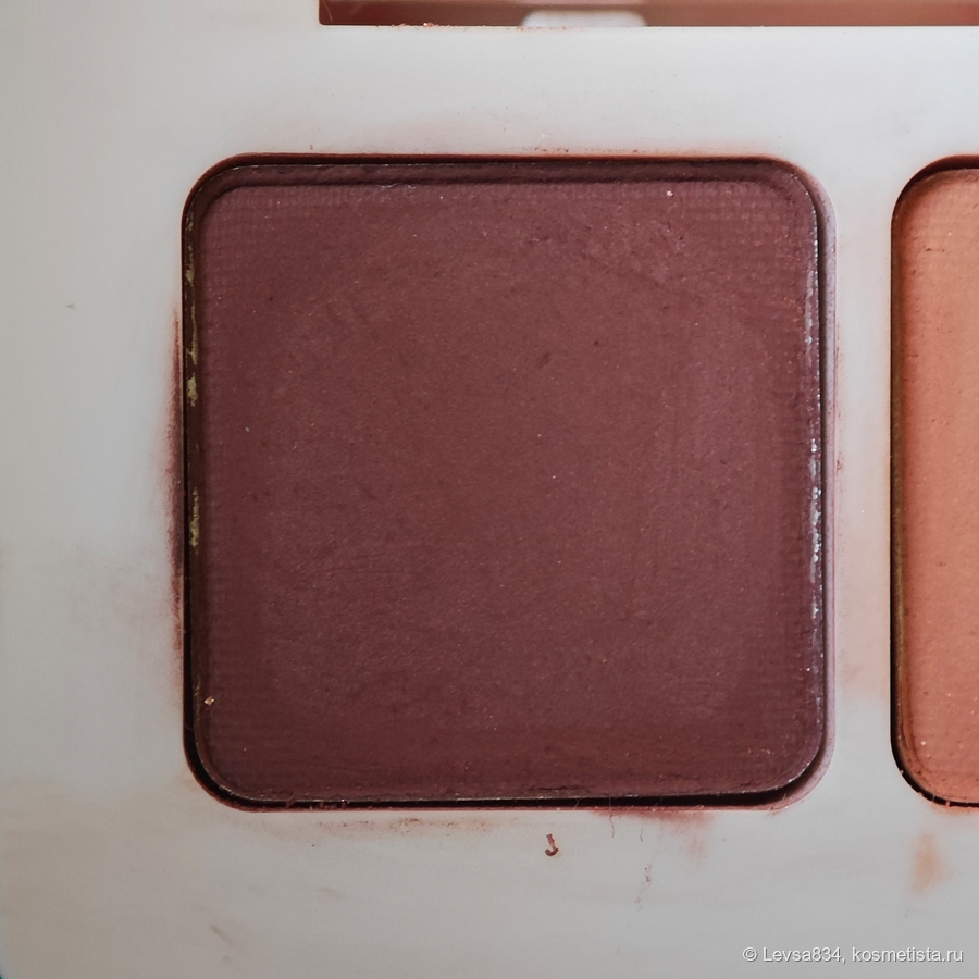 Тёмный коричневый матовый, сухой, очень пигментированный, при неаккуратном нанесении может осыпаться. Растушевать его можно, но не так просто, в основном я обращаюсь с этим оттенком так: либо набираю на кончики ворсинок плоской кисти и затемняю ресничный край, прикладывая кисть, без движения в стороны, либо набираю так же на кончики ворсинок пышной кисти и прикладываю к веку, стараясь создать равномерное покрытие, а после растушёвываю его, а края разбавляю одним из оставшихся матовых из палетки. Единственный холодный оттенок в тёплой палетке.