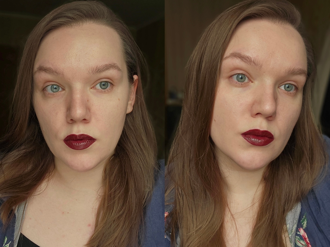 Помада может незначительно, буквально на доли миллиметра, потечь с губ в кисетные складки. Хорошо то, что губы оттенок вообще не тинтует, если начались непотребства всякие на жаре, размазалось — салфетка снимает всё и сразу.
