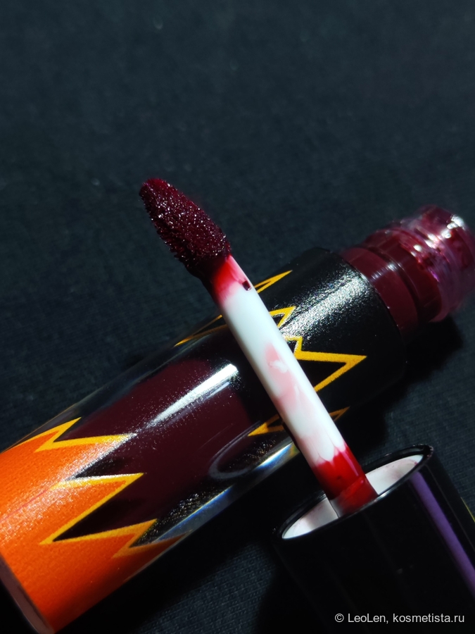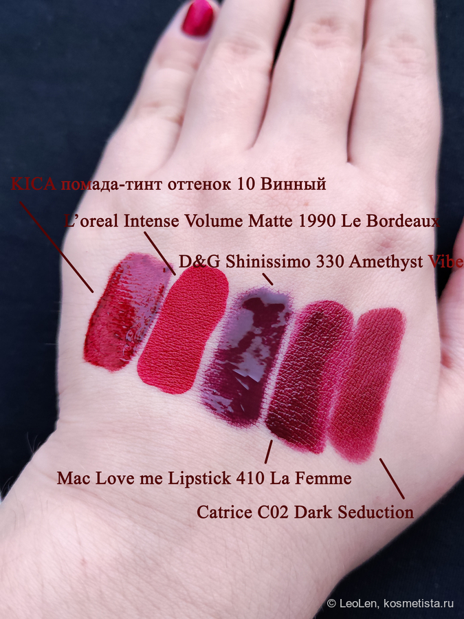 Помада-тинт красивого тёмного бордового оттенка, финиш глянцевый. Въедается в кожу губ как положено всем тинтам и держится достаточно стойко. На оф. ресурсах пишут о стойкости до 12 часов. Я столько не проверяла, но часов на 6-7 её хватит. Если вообще не есть / не пить то может и продержится все заявленные.