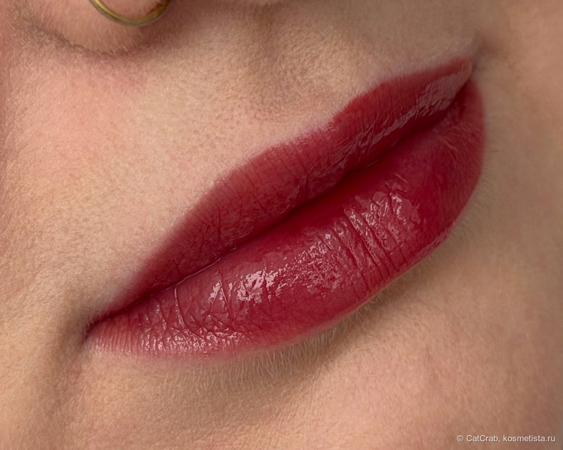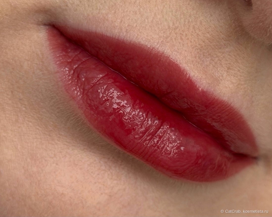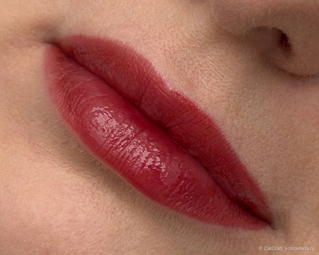 Через полтора часа глянцевое покрытие сходит и остаётся яркий, но такой безумно красивый тинт на губах.