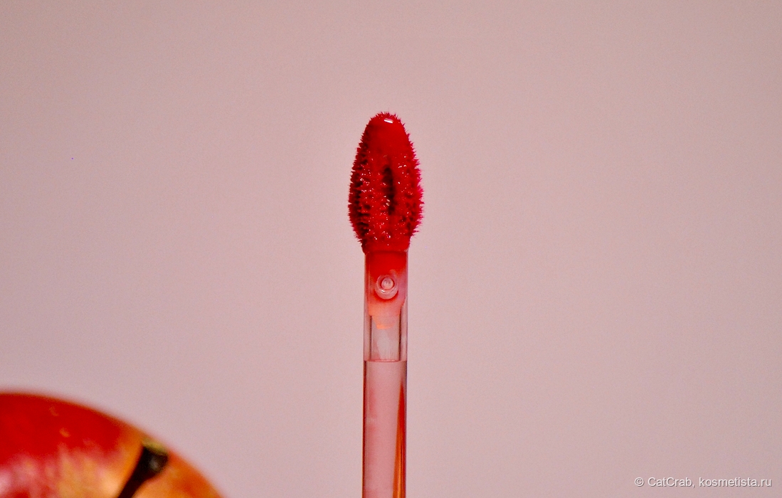 Текстура у тинта интересная — не водянистая, а достаточно плотная и гелевая. Наносится на губы идеально, приятно скользит по ним, за контур не течёт, липкости нет.