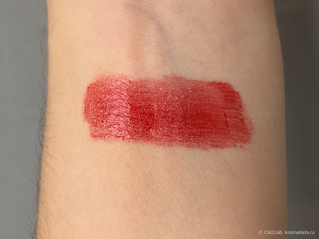 Покрытие глянцевое, равномерное — несмотря на яркий оттенок, продукт очень однородно и легко ложится на губы.