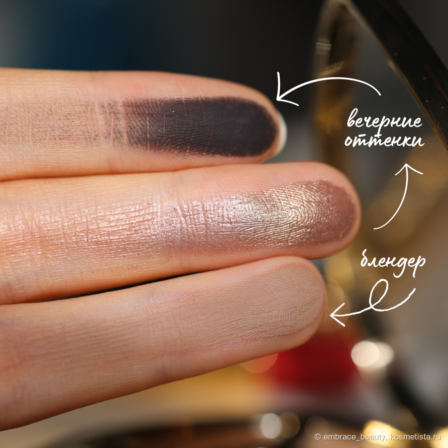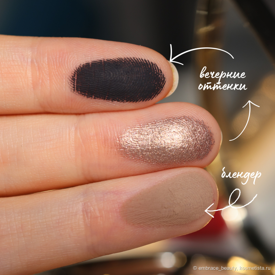 Вечерний вариант отличается от дневного тем, что производитель решил добавить сюда угольно черный оттенок, а сатин, который находится на центре глаза, совсем немного темнее того, что на дневой стороне. Темнее и немного розовее, хотя в палетке и на свотчах на пальце они кажутся более различимыми.