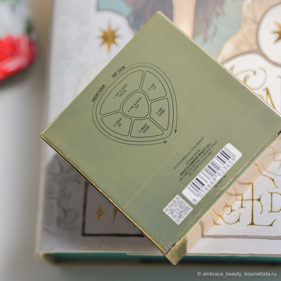 С обратной стороны палетки вторвляется информация про размещение вечерних и дневных оттенков, а так же вес и производитель.