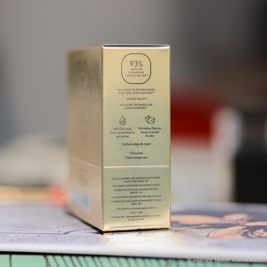 Еще я хочу заметить тот факт, что палетка не просто болтается в золотой коробочке, а надержно зафиксирована в плотном картоне, который вообще не позволяет палетке трястись и двигаться.