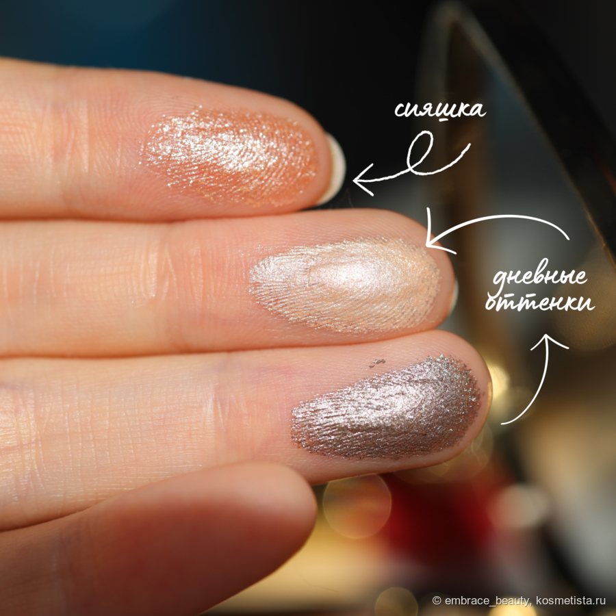 Тоже самое касается сатинов и сияшки: они набираются одним легким движением, оставляя добротный свотч на пальцах.