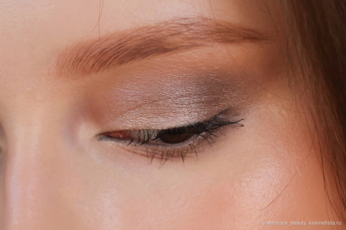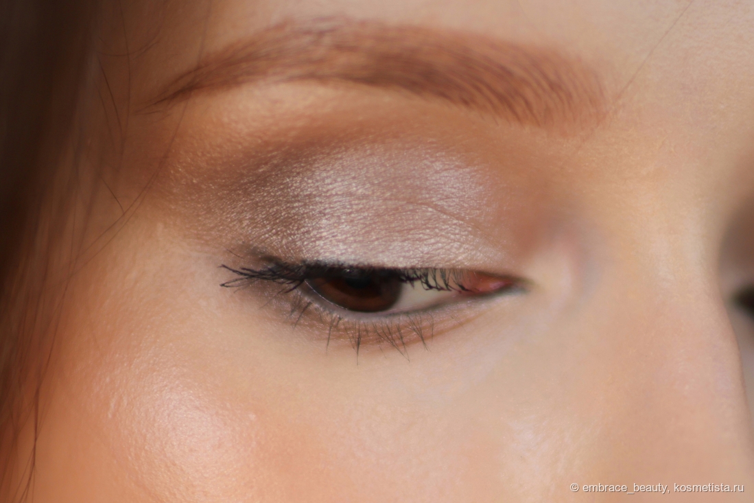 Тени набираются на кисть так же легко, как и на палец. Самое интересное, что они практически не осыпаются (я не фотошопила фото, осыпашек даже почти и нет), ложаться и тушуются прекрасно, мягко уходя в кожу. Получилось очень нежно и действительно подходит для походов на работу, на прогулку, в магазин и тд.