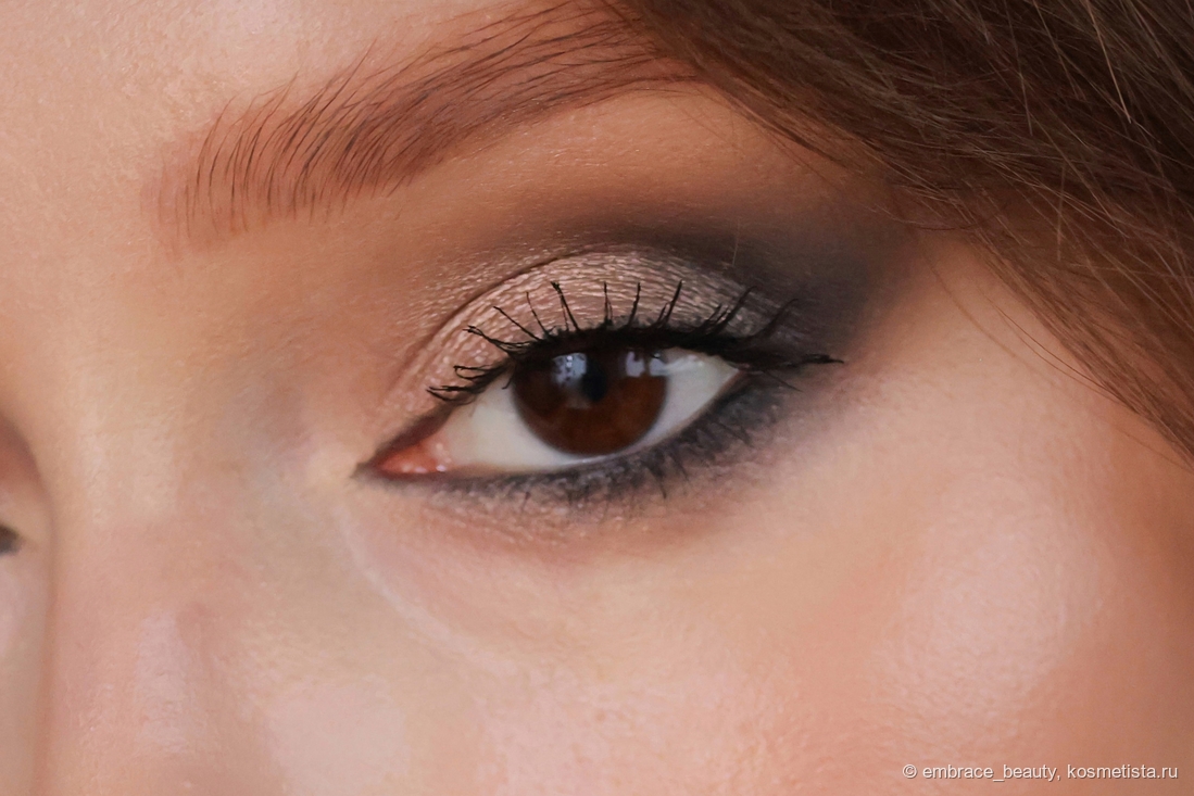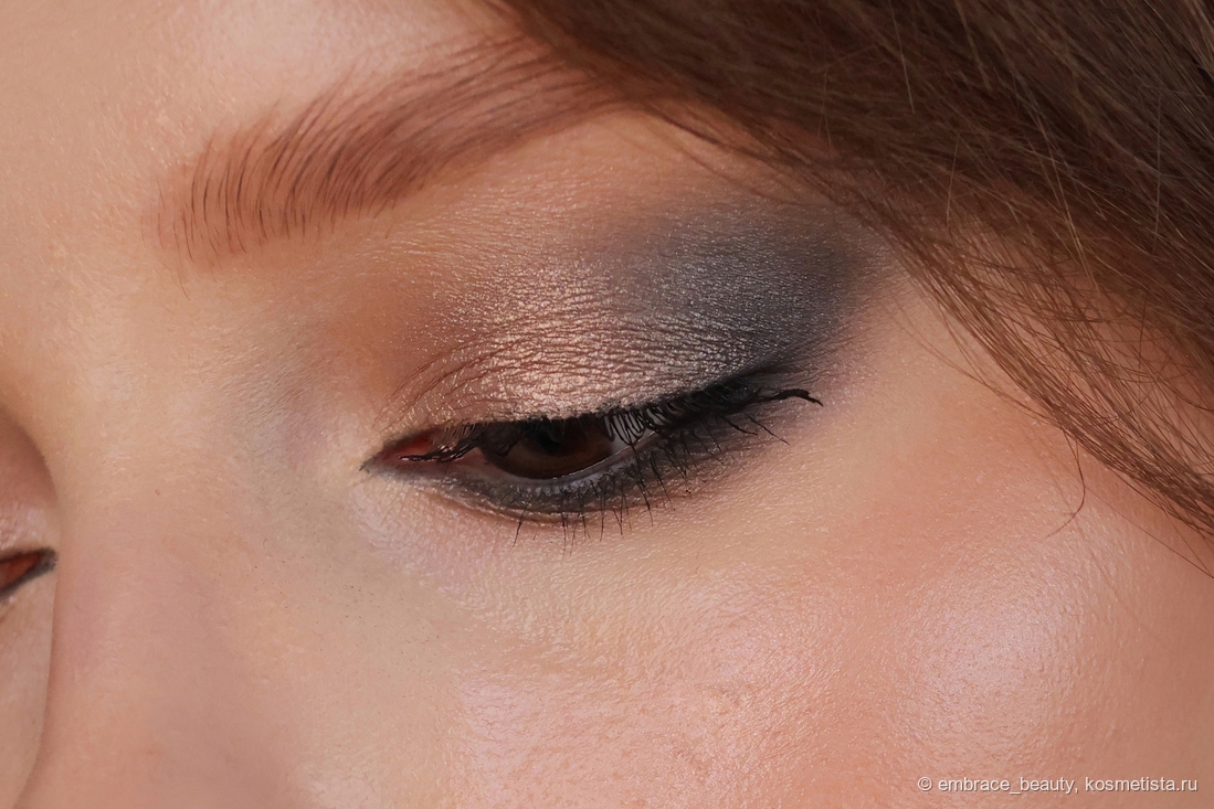 Так же, как и дневные тени, вечерние ложаться хорошо. Даже черный оттенок обошелся минимальными осыпаниями, которые я легко смахнула кистью ( он даже не размазлся и не протянулся в «дорожку»).