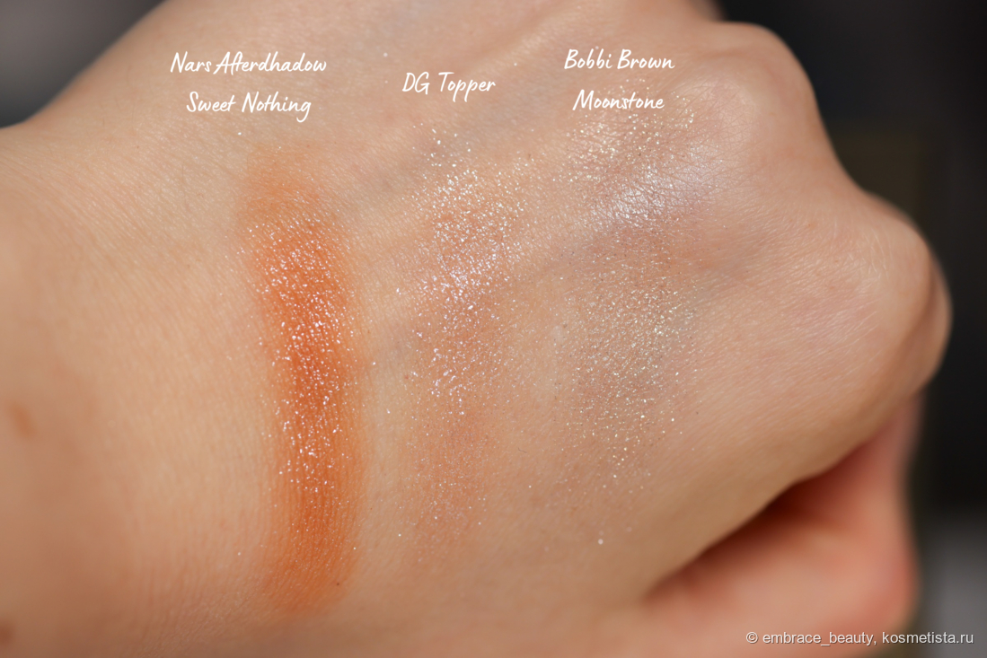 Топпер от DG больше всего перекликается с заветными сияшками от Bobbi Brown, в особенности с оттенком Moonstone.