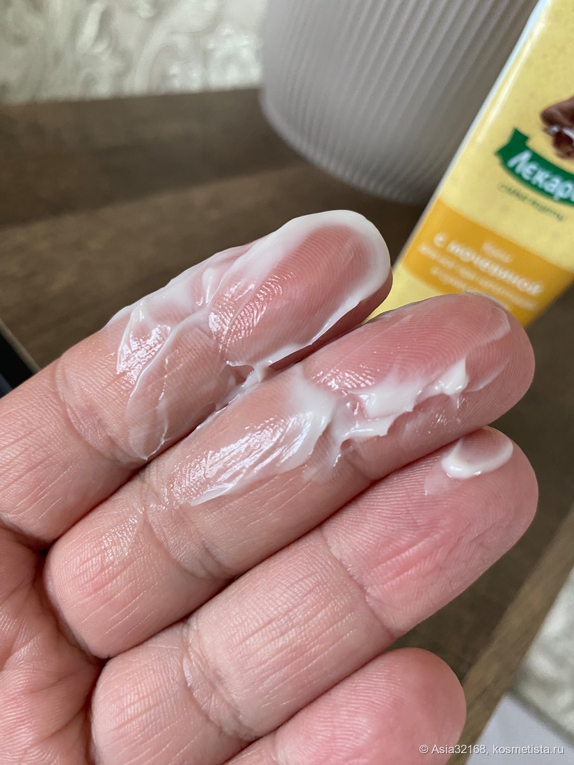 Консистенция у крема не очень плотная, не жирная. Я бы назвала её легкой. При нанесении быстро и хорошо впитывается, сразу ощущается как кожа размягчается.