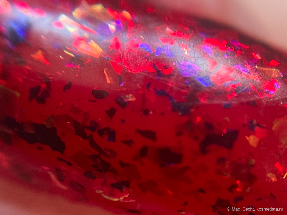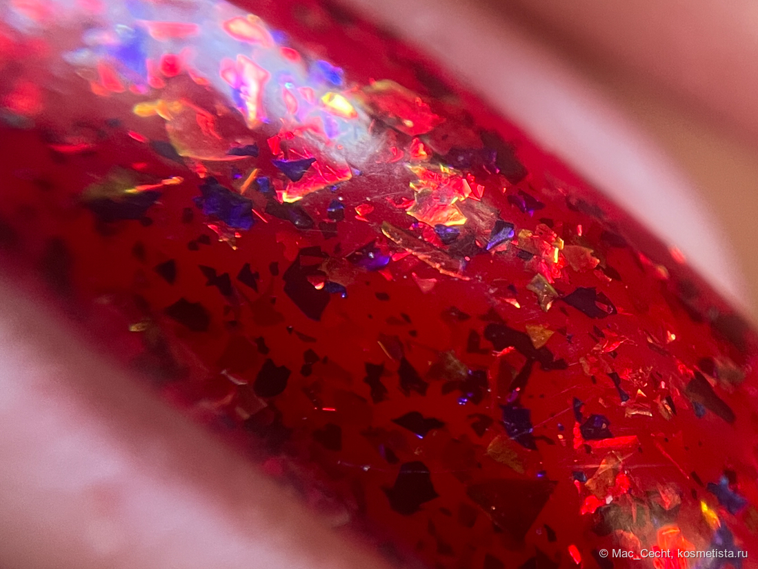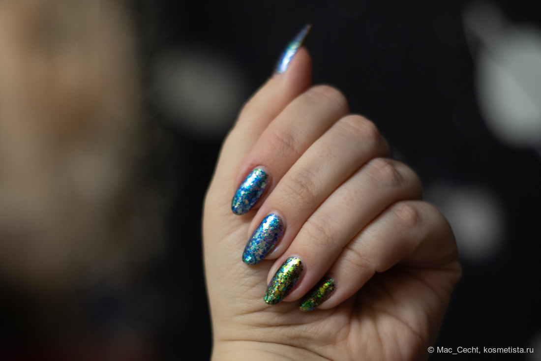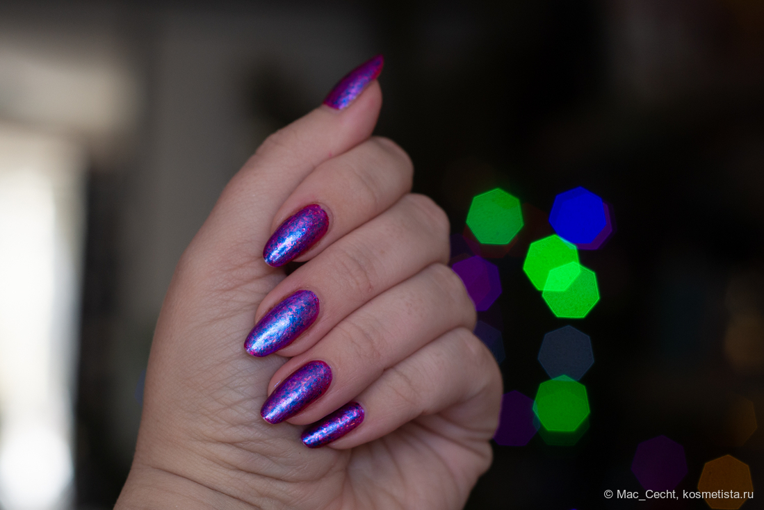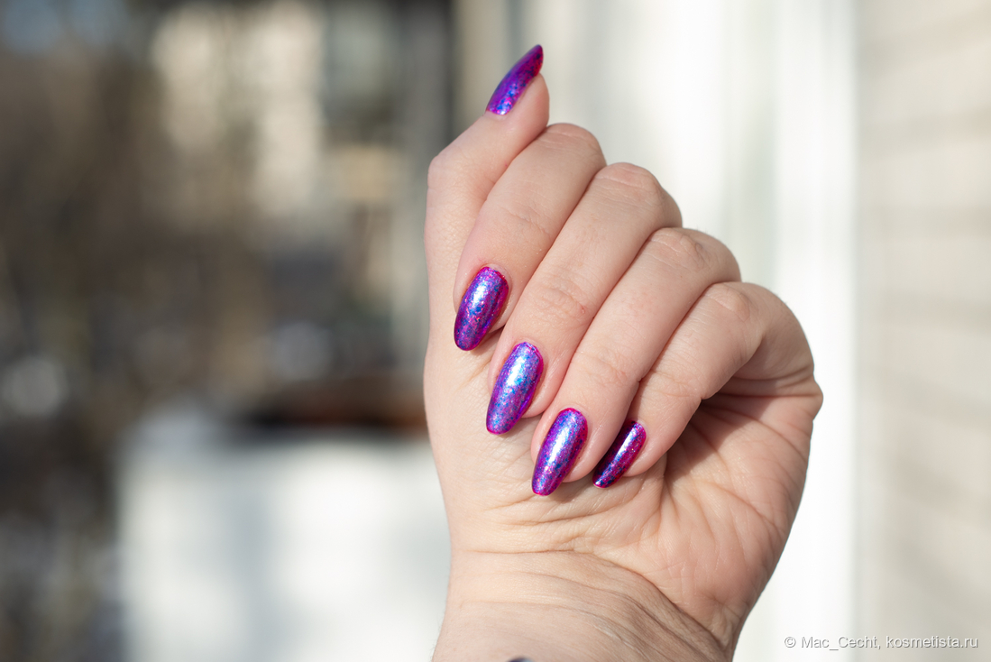 Голографическая крошка яркая. Она голографит даже при дневном свете и, конечно, выдает радужную магию под искусственным светом.