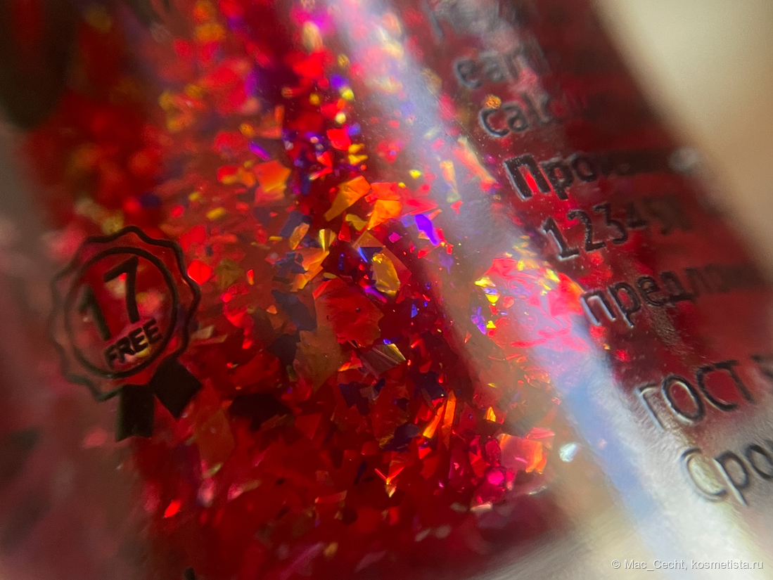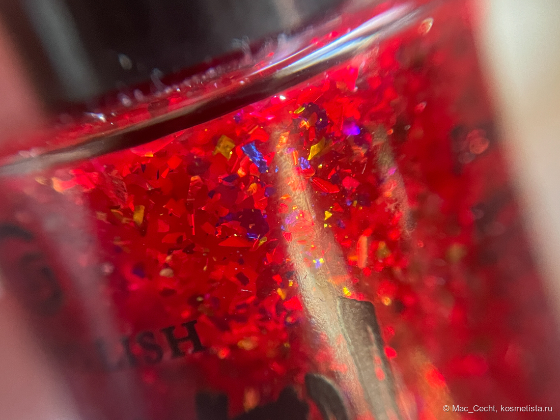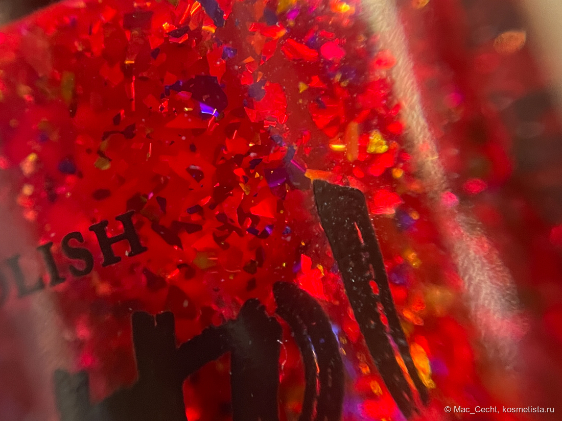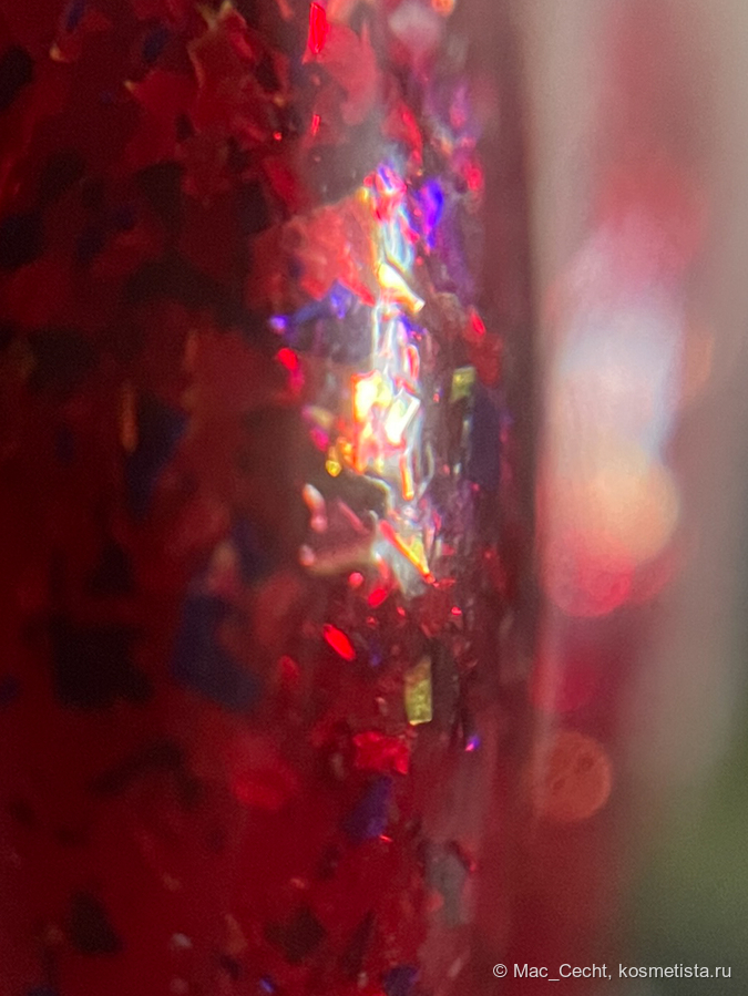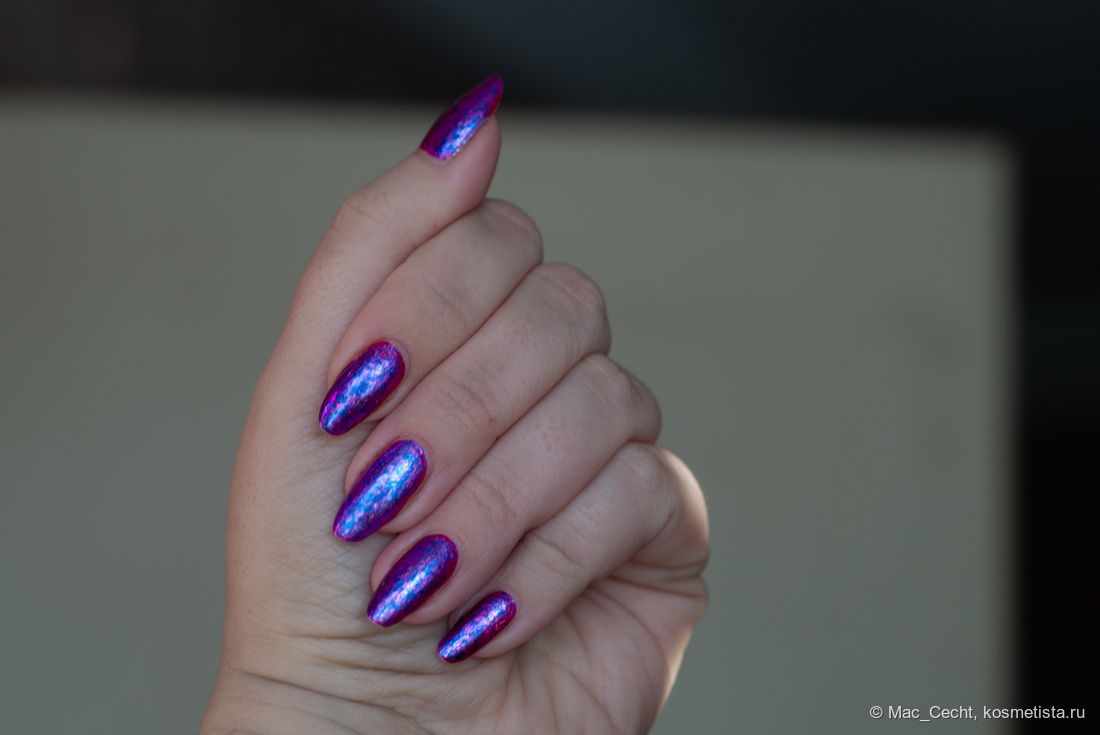 Голографическая крошка яркая. Она голографит даже при дневном свете и, конечно, выдает радужную магию под искусственным светом.