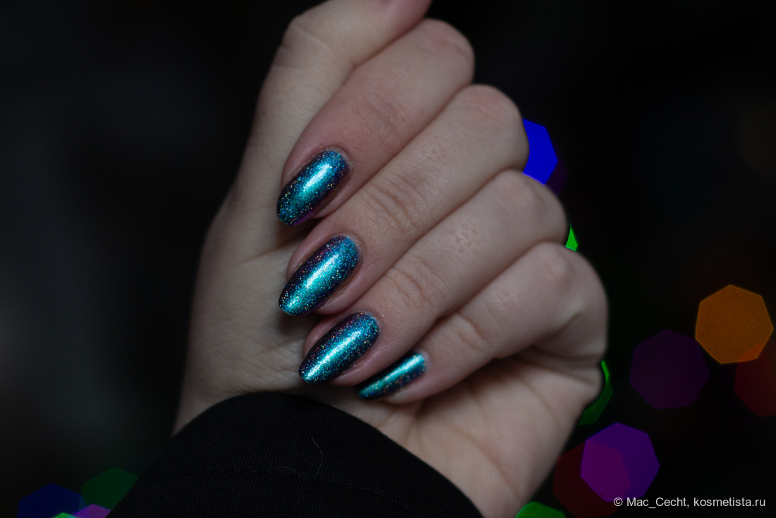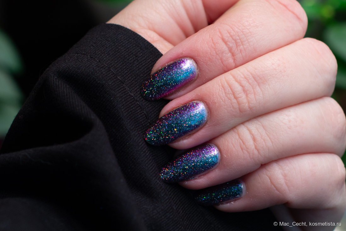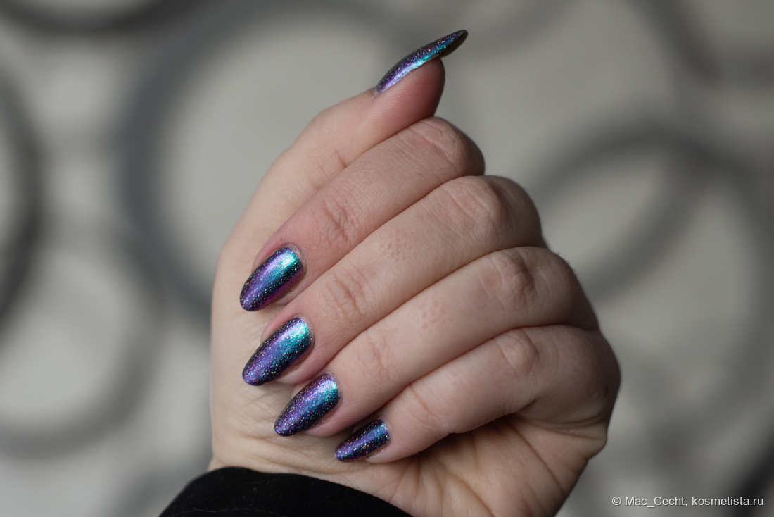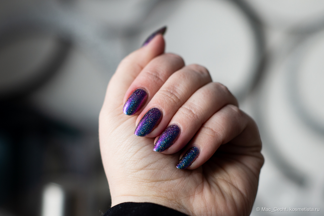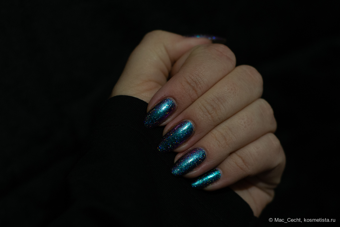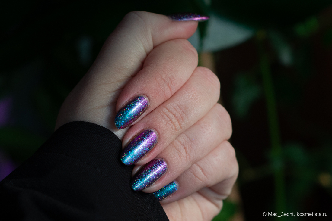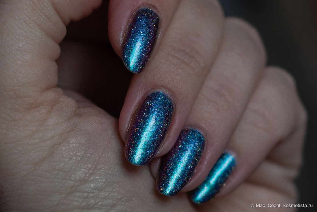 Сохнет быстро, сушек не требует, хотя под глянцевым топом, конечно, будет красив. Шиммер магически переливается на солнце и в искусственном свете.