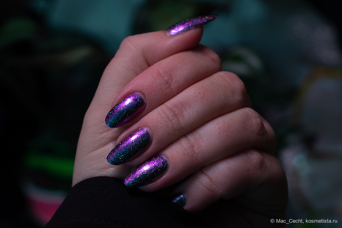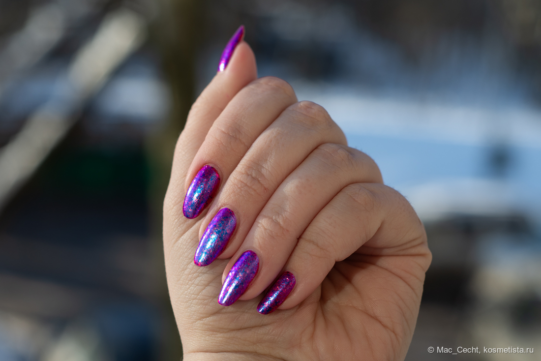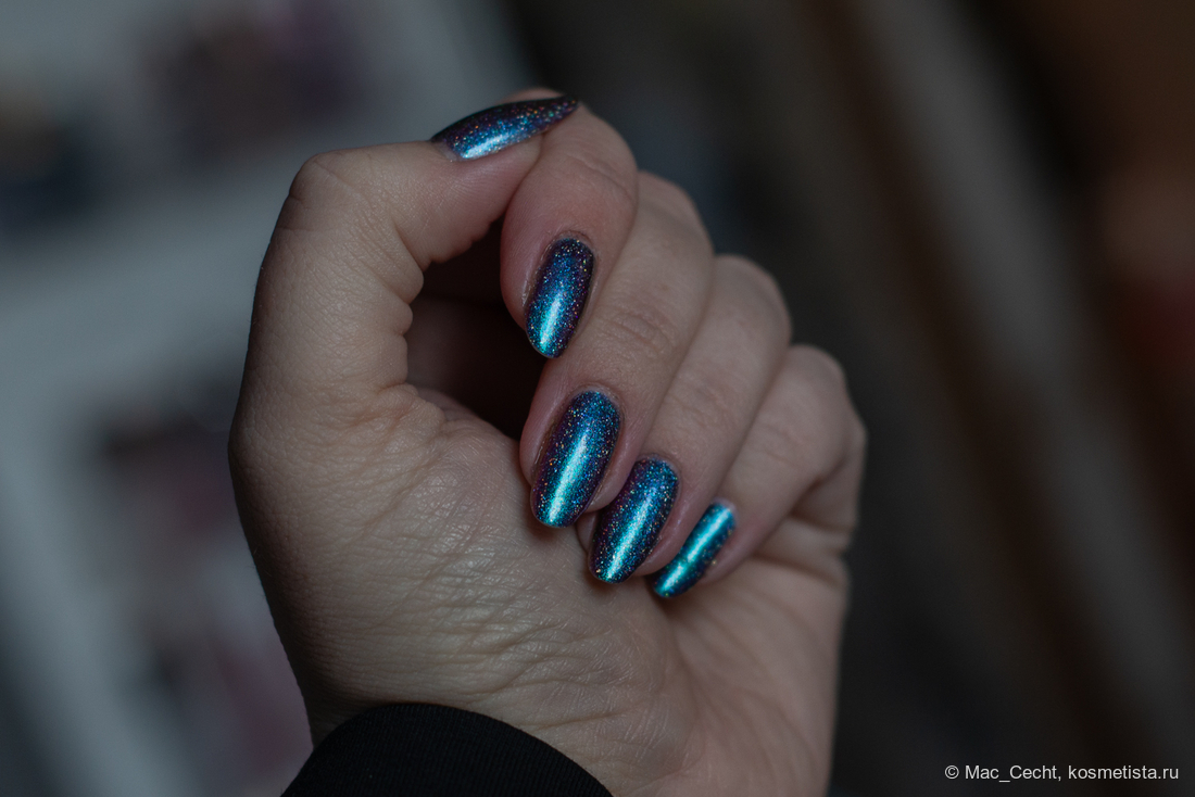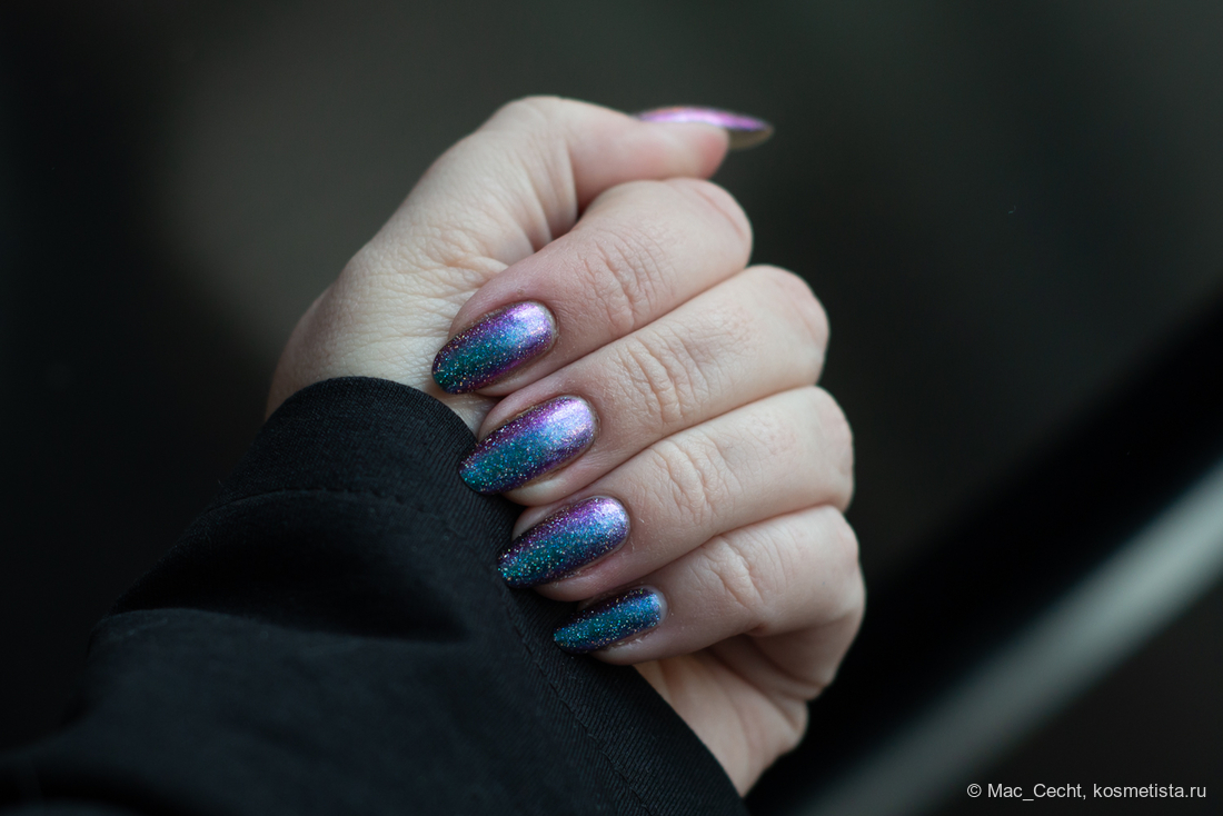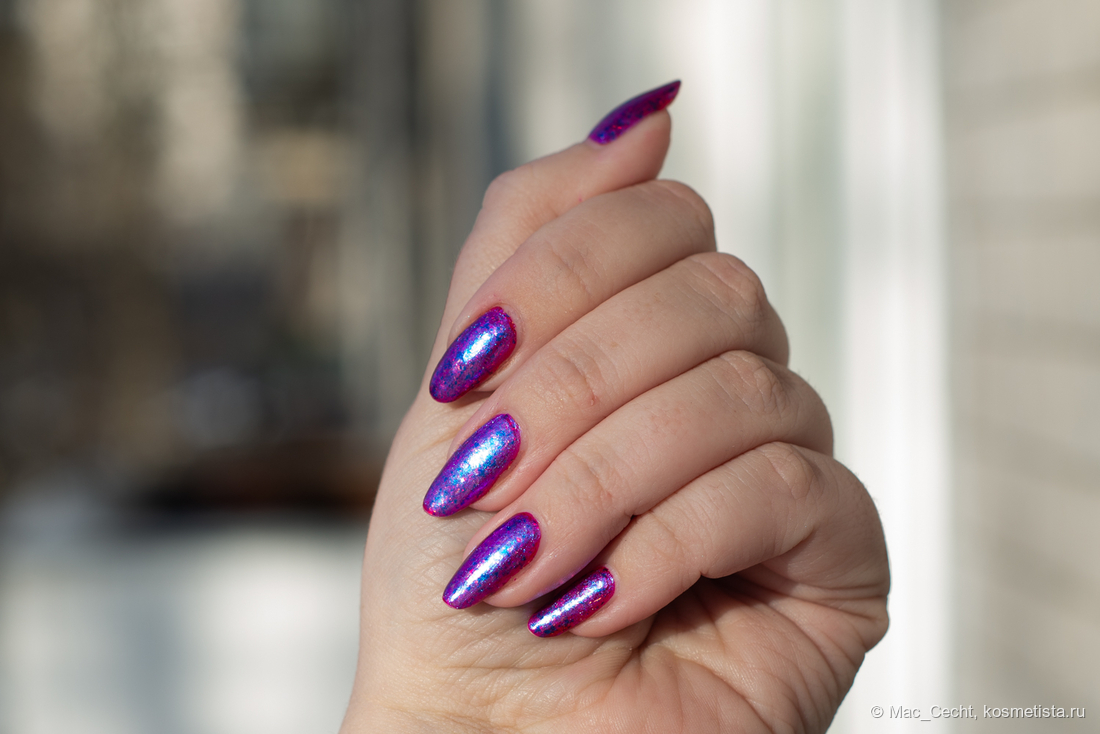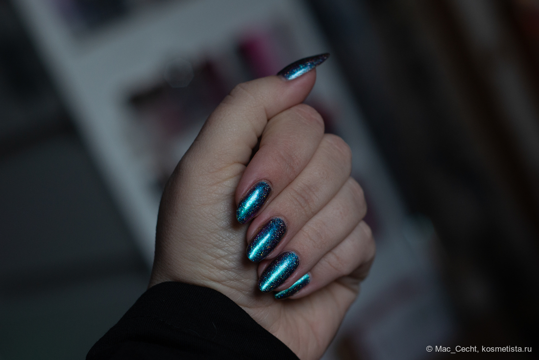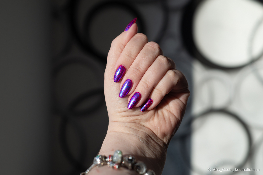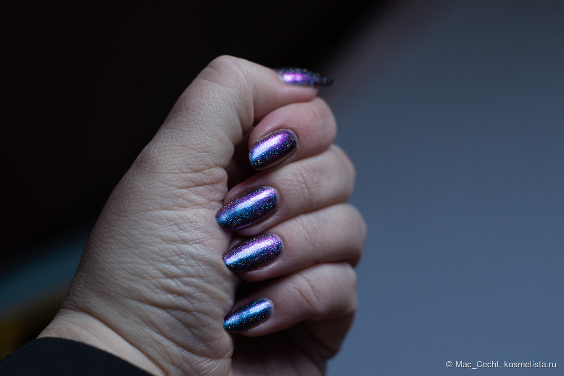 Сохнет быстро, сушек не требует, хотя под глянцевым топом, конечно, будет красив. Шиммер магически переливается на солнце и в искусственном свете.
