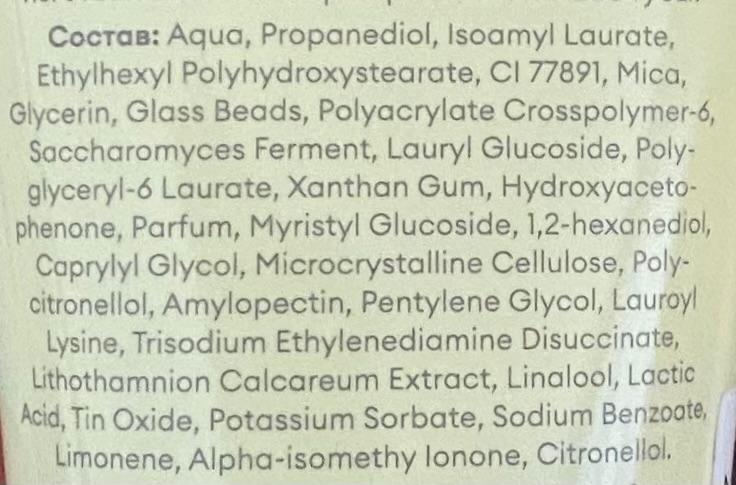 В составе есть увлажняющие глицерин и пропандиол, светоотражающие частицы для эффекта glow и компоненты для выравнивания рельефа кожи.