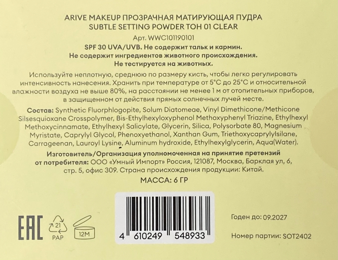 Arive Makeup Прозрачная матирующая пудра SPF 30 Subtle Setting Powder
