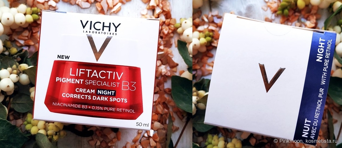 Так как у меня кожа склонная к пигментации, я всегда стараюсь использовать кремы, которые выравнивают тон, поэтому начну с ночного крема Vichy Liftactiv Pigment Specialist B3 Night Cream with Pure Retinol. Крем упакован в картонную коробочку.