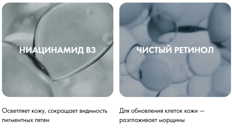 Состав длинный, но главные активные компоненты — это чистый ретинол и витамин В3.