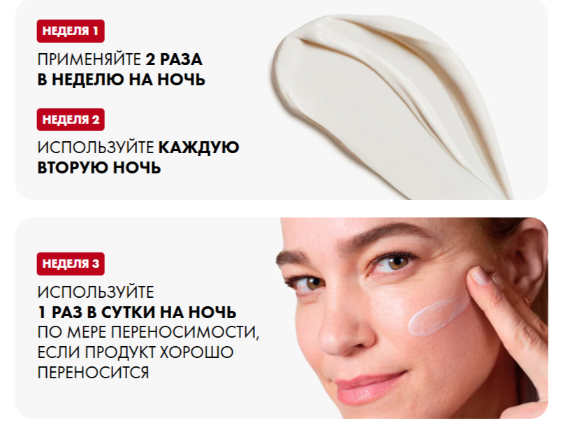 Так как в составе чистый ретинол, производитель предлагает следующую схему нанесения крема.